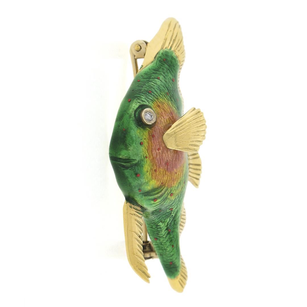 A solid 18k yellow gold fish brooch, with multi colors enamel & 1 round natural diamond. Measures 43.2x24.5mm and weighs a total of 10.09 grams.