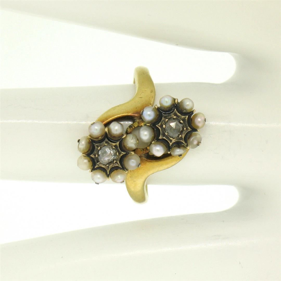 One 18k Gold French Victorian Antique 0.25ctw 2 Rose Diamonds Seed Pearl & Black Enamel Bypass Ring. Item Details: Material: 18K Solid Yellow Gold, Weight: 3.7 Grams, Stone(s): (2) Natural Genuine Diamonds - Rose Cut - Prong Set - 0.25ctw (approx.), (16) Natural Genuine Seed Pearls - Round Shape - Wire Set, Black Enamel Surrounds the Diamonds, Total Carat Weight: 0.25 (approx.), Ring Size: 6.0 (We can custom size this ring.), Ring Width: 16.5mm Ring Height: 4.2mm rise off the finger Condition: Antique ring, excellent condition for a rare piece like this.