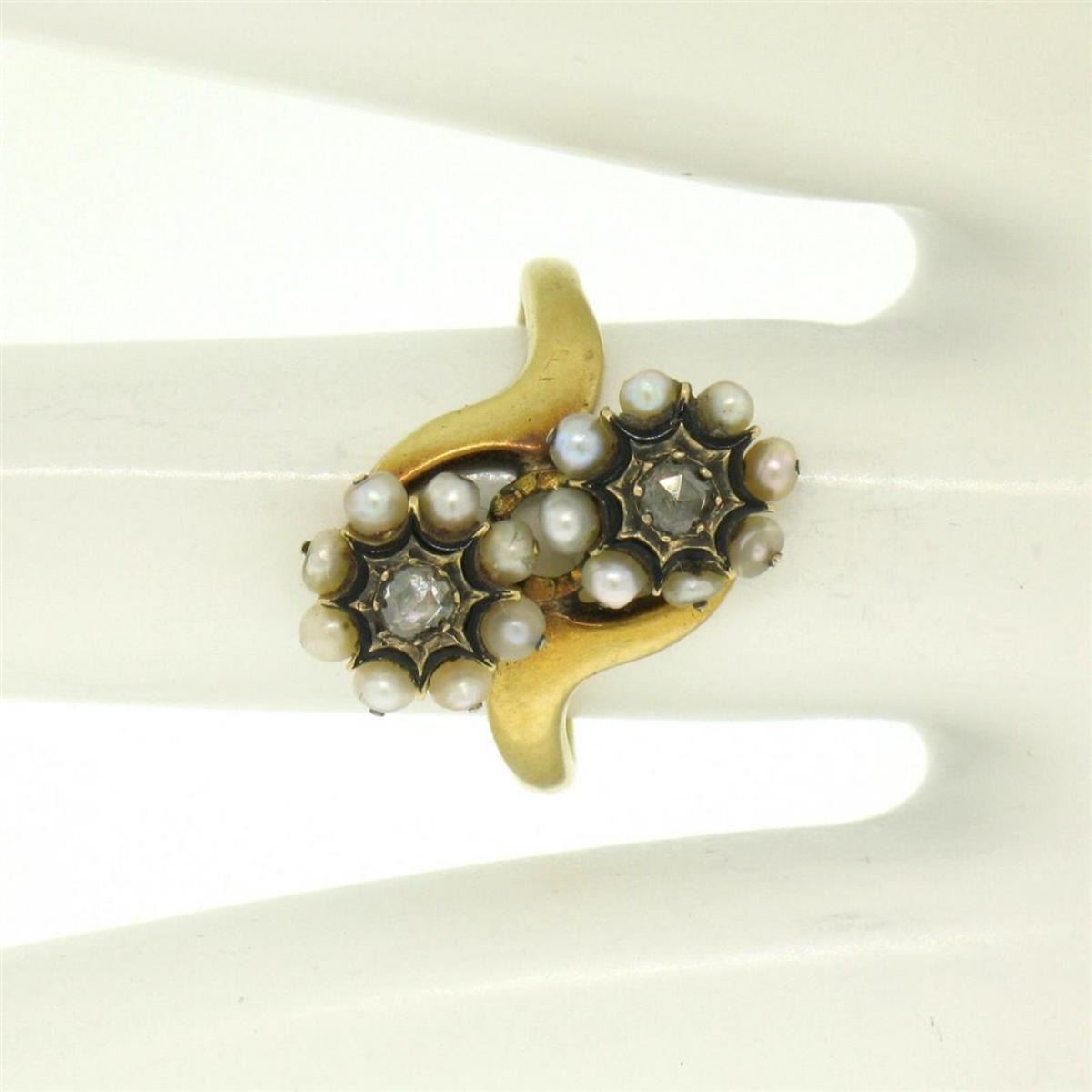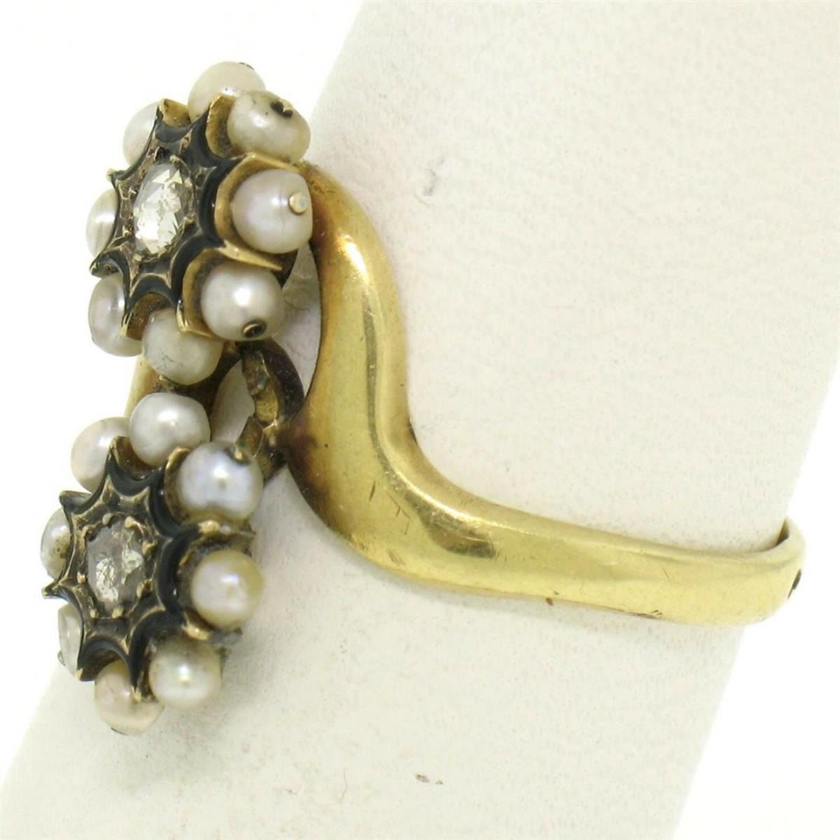 One 18k Gold French Victorian Antique 0.25ctw 2 Rose Diamonds Seed Pearl & Black Enamel Bypass Ring. Item Details: Material: 18K Solid Yellow Gold, Weight: 3.7 Grams, Stone(s): (2) Natural Genuine Diamonds - Rose Cut - Prong Set - 0.25ctw (approx.), (16) Natural Genuine Seed Pearls - Round Shape - Wire Set, Black Enamel Surrounds the Diamonds, Total Carat Weight: 0.25 (approx.), Ring Size: 6.0 (We can custom size this ring.), Ring Width: 16.5mm Ring Height: 4.2mm rise off the finger Condition: Antique ring, excellent condition for a rare piece like this.