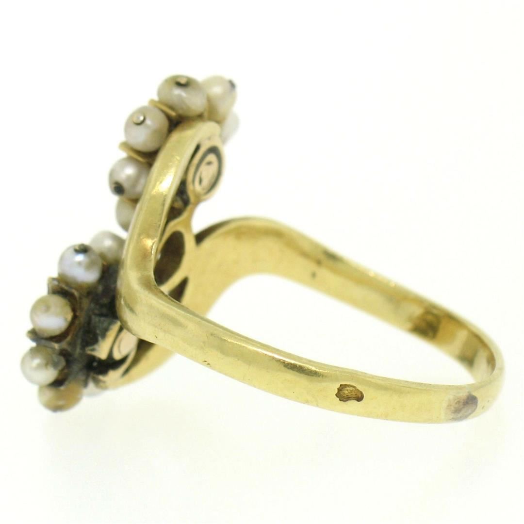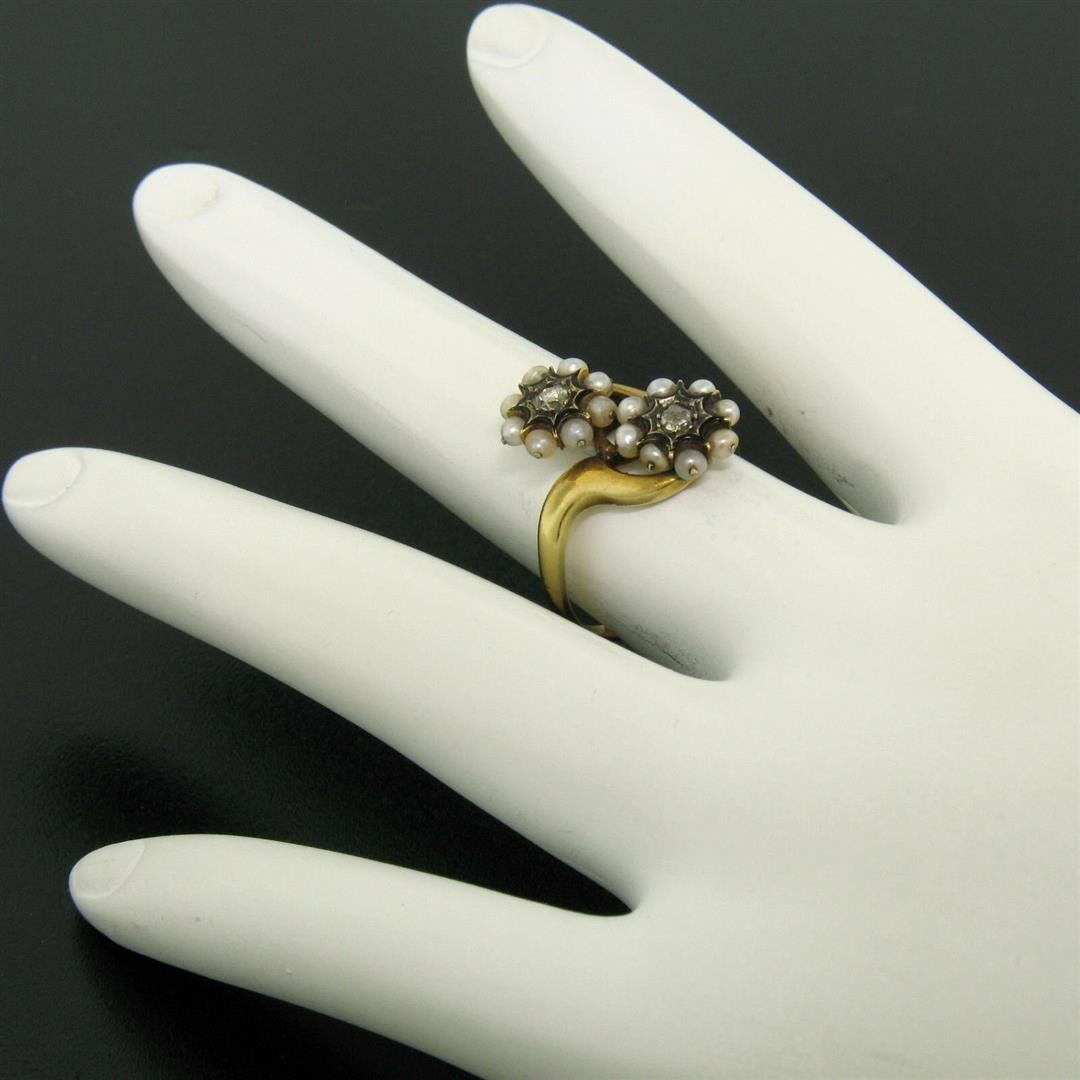 One 18k Gold French Victorian Antique 0.25ctw 2 Rose Diamonds Seed Pearl & Black Enamel Bypass Ring. Item Details: Material: 18K Solid Yellow Gold, Weight: 3.7 Grams, Stone(s): (2) Natural Genuine Diamonds - Rose Cut - Prong Set - 0.25ctw (approx.), (16) Natural Genuine Seed Pearls - Round Shape - Wire Set, Black Enamel Surrounds the Diamonds, Total Carat Weight: 0.25 (approx.), Ring Size: 6.0 (We can custom size this ring.), Ring Width: 16.5mm Ring Height: 4.2mm rise off the finger Condition: Antique ring, excellent condition for a rare piece like this.