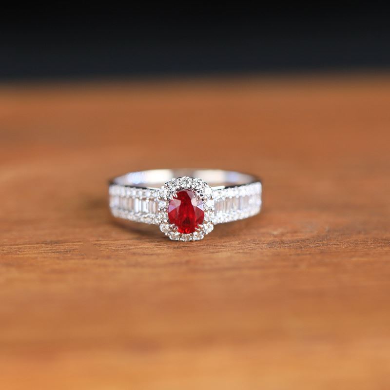 This 18k gold ring features a brilliant ruby at its center, surrounded by exquisite diamonds and rectangular-cut gemstones that create a luxurious and elegant design. The vivid red of the ruby, paired with the sparkle of the diamonds, offers a unique and captivating look, perfect for any special occasion.Ring size: 6, circumference: 52 mm, diameter: 16.6 mm, total weight: 4.16g.Note: GUILD certificate, comes with a jewelry, gemstone, and precious metal authentication certificate.