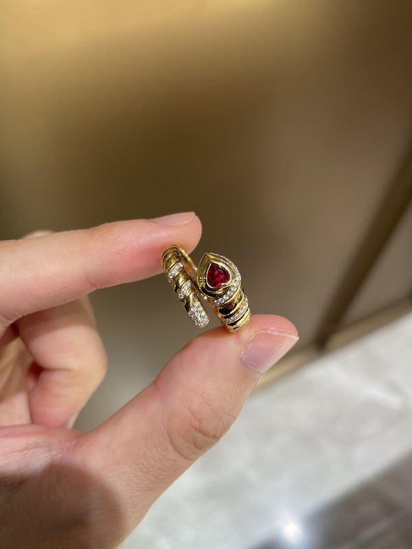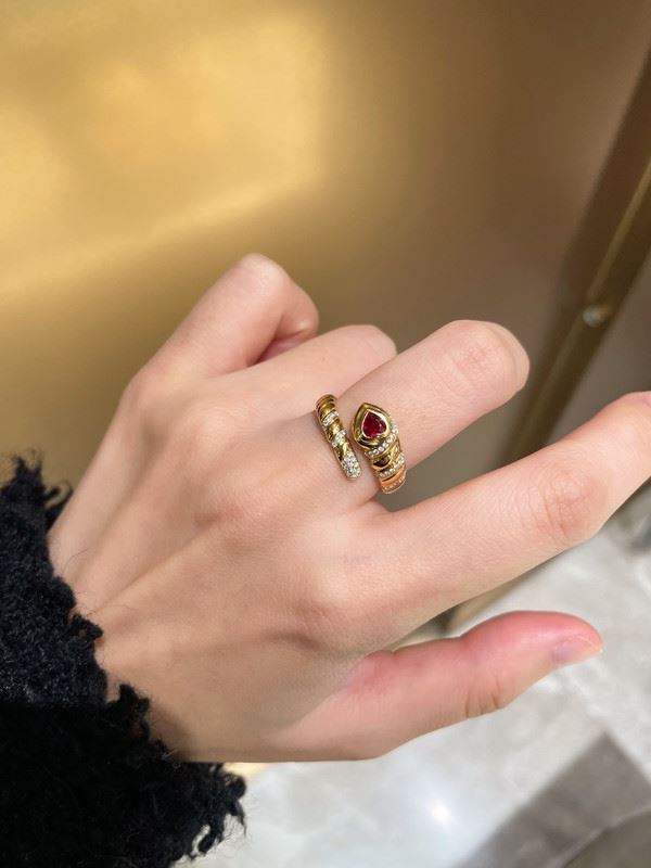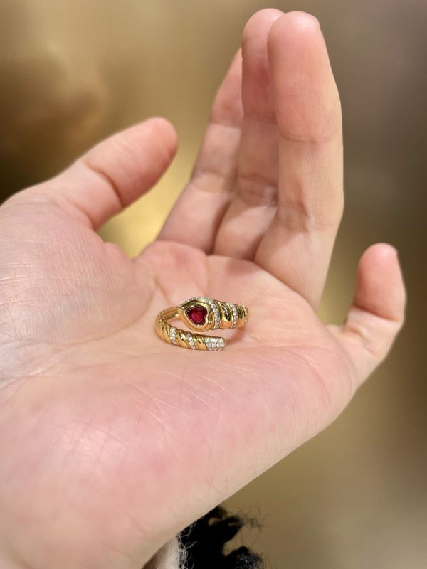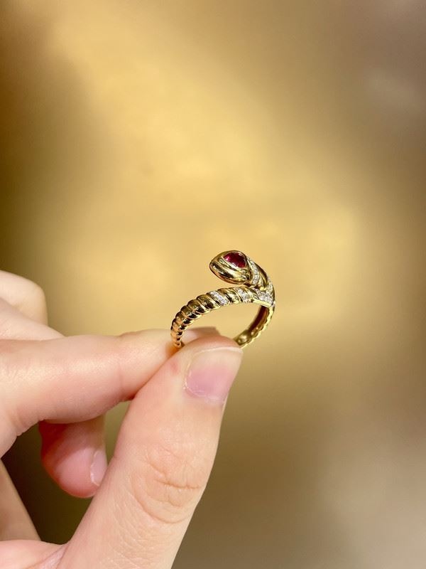 This 18k gold ring features a unique twisted band design, with a beautiful ruby at the center and sparkling diamonds surrounding it. The deep red of the ruby, combined with the brilliance of the diamonds, creates a dynamic and luxurious aesthetic, perfect for any special occasion.Ring size: 6, circumference: 52 mm, diameter: 16.6 mm, total weight: 4.1g.Note: GUILD certificate, comes with a jewelry, gemstone, and precious metal authentication certificate.