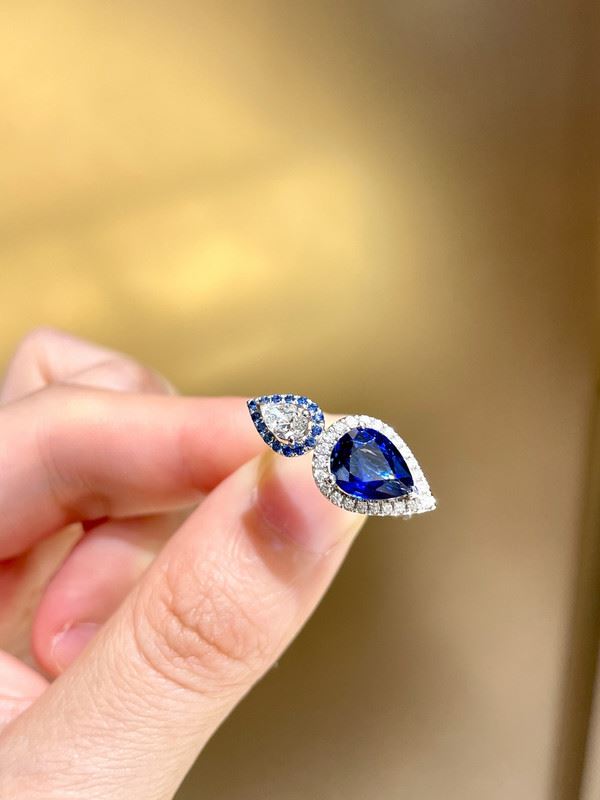 This 18k gold sapphire ring features a sophisticated design with two dazzling sapphires. The central oval sapphire is beautifully complemented by two small triangular sapphires, and the surrounding diamonds add extra brilliance. It’s a piece of jewelry with both collectible value and captivating charm.Ring size: 6, circumference: 52 mm, diameter: 16.6 mm, total weight: 4.51g.Note: GUILD certificate, comes with a jewelry, gemstone, and precious metal authentication certificate.