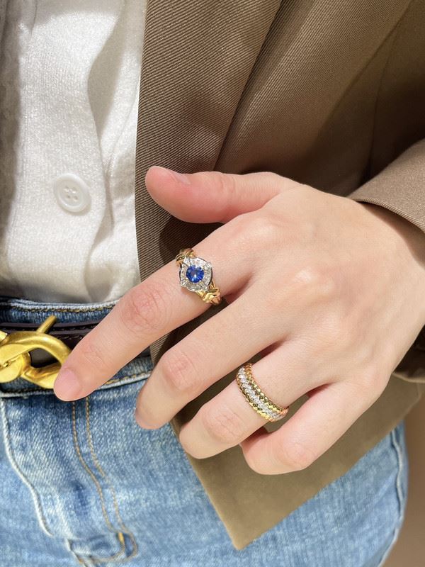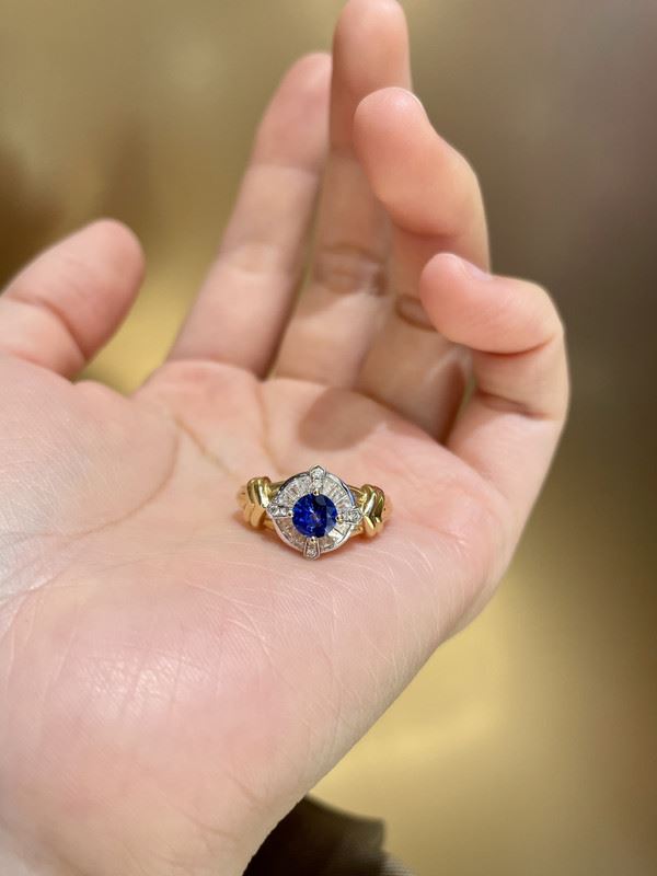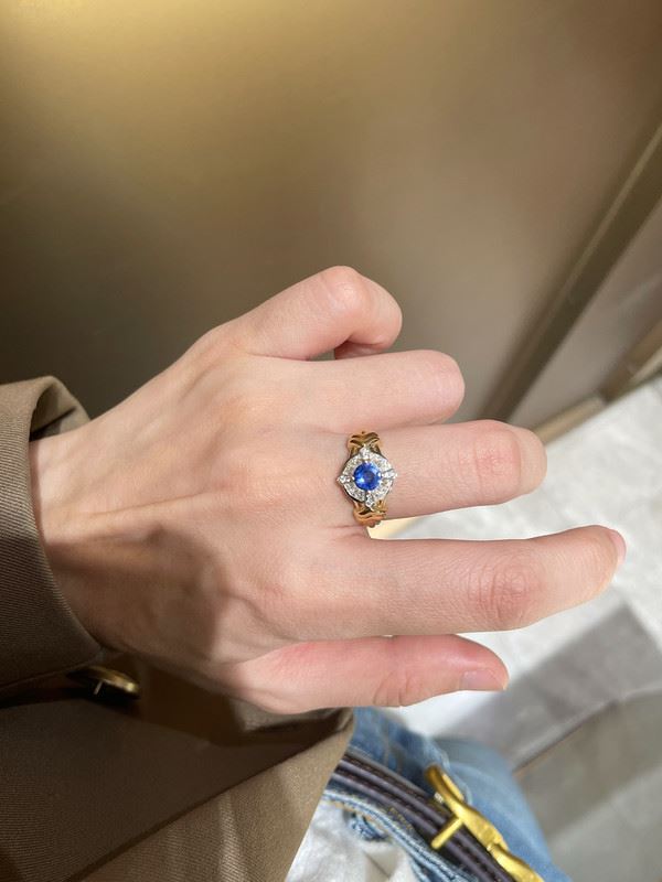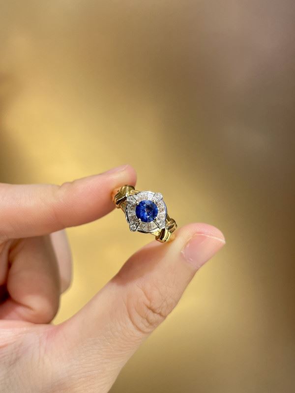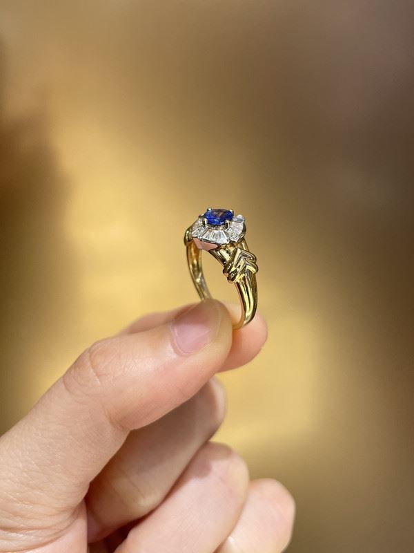This 18k gold ring features a dazzling sapphire at its center, surrounded by delicate diamonds that enhance its elegance and luxury. The deep blue of the sapphire, paired with the brilliance of the diamonds, creates an unparalleled charm, making it perfect for any formal occasion.Ring size: 6, circumference: 52 mm, diameter: 16.6 mm, total weight: 4.82g.Note: GUILD certificate, comes with a jewelry, gemstone, and precious metal authentication certificate.