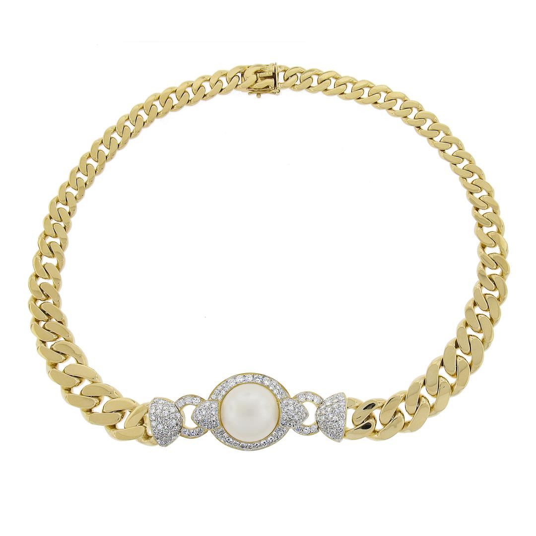 A solid 18k yellow gold set of necklace & bracelet, featuring 2 round shape cultured south sea pearls (16.7mm each), and numerous of round cut natural diamonds (G-I Color - VS1/VS2; 7.65ctw). the set weighs a total of 175.84 grams, the necklace measures 22.5mm wide, and measures 15.5 inches in length & the bracelet measures 21.8mm wide, and measures 7.25 inches in length