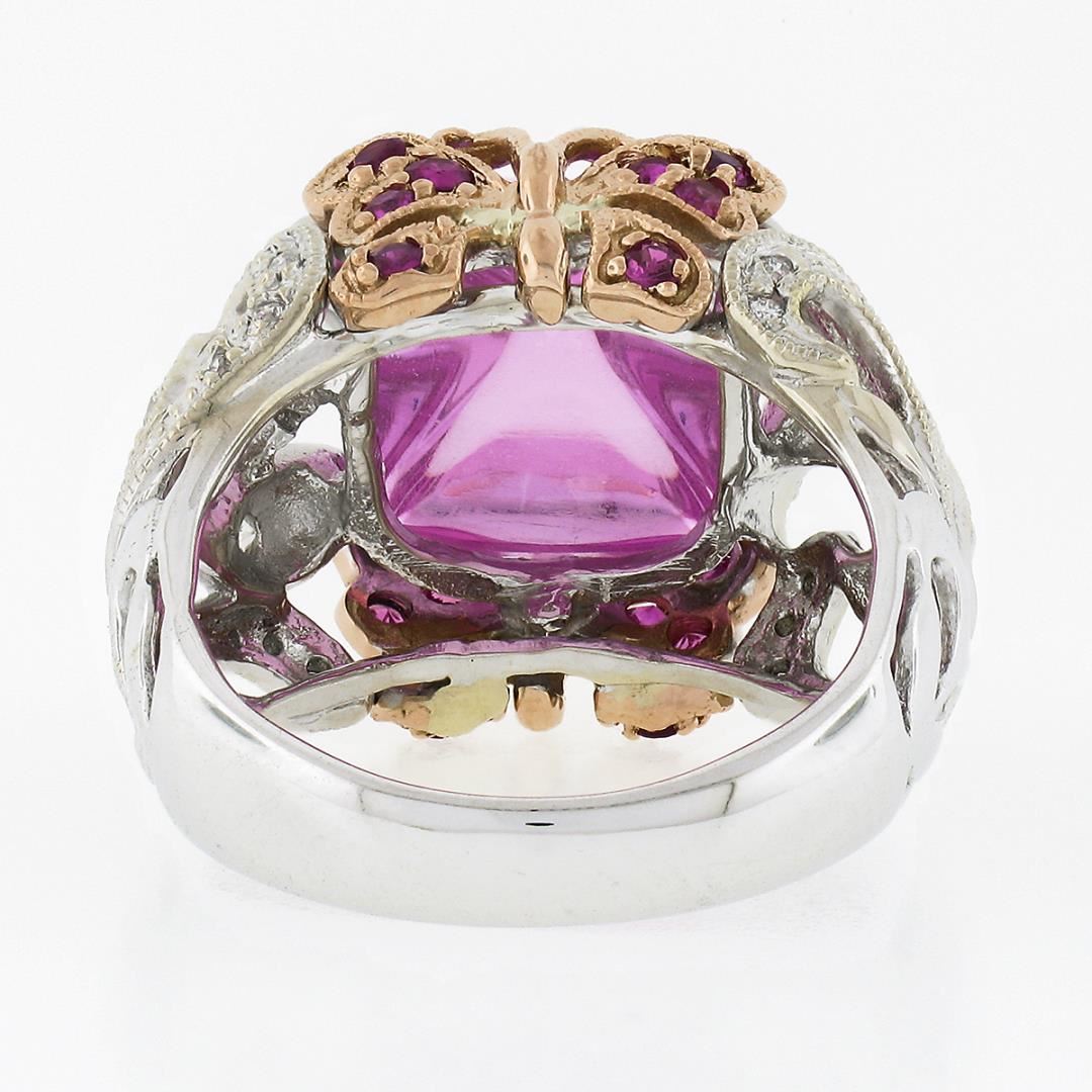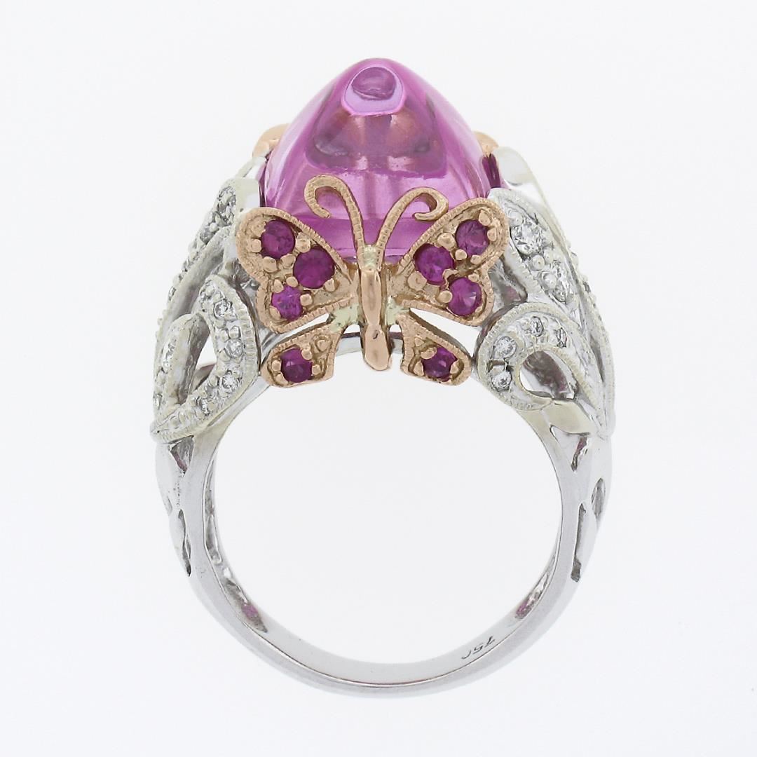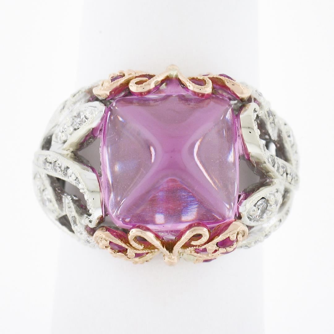 A solid 18k white & yellow gold cocktail ring, with 1 GIA graded sugarloaf cut synthetic pink sapphire (12.06 x 11.08 x 8.25 mm), and 16 round cut natural pink sapphires (0.50ctw), and 36 round cut natural diamonds (G/H - VS1/VS2 ; 0.50ctw ). The ring is size 6.0, weighs a total of 11.49 grams, and measures 16.40mm wide. Comes with all original relevant certifications.