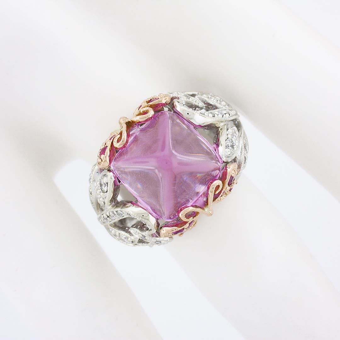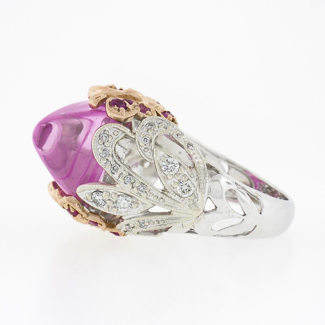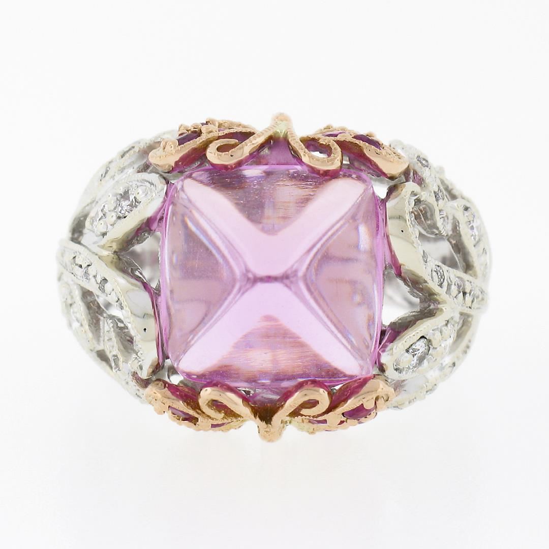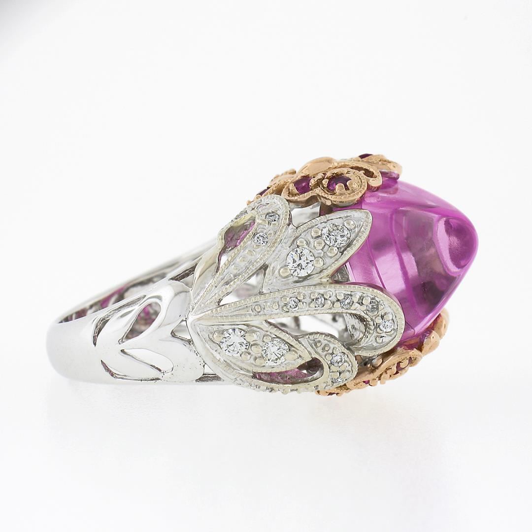 A solid 18k white & yellow gold cocktail ring, with 1 GIA graded sugarloaf cut synthetic pink sapphire (12.06 x 11.08 x 8.25 mm), and 16 round cut natural pink sapphires (0.50ctw), and 36 round cut natural diamonds (G/H - VS1/VS2 ; 0.50ctw ). The ring is size 6.0, weighs a total of 11.49 grams, and measures 16.40mm wide. Comes with all original relevant certifications.