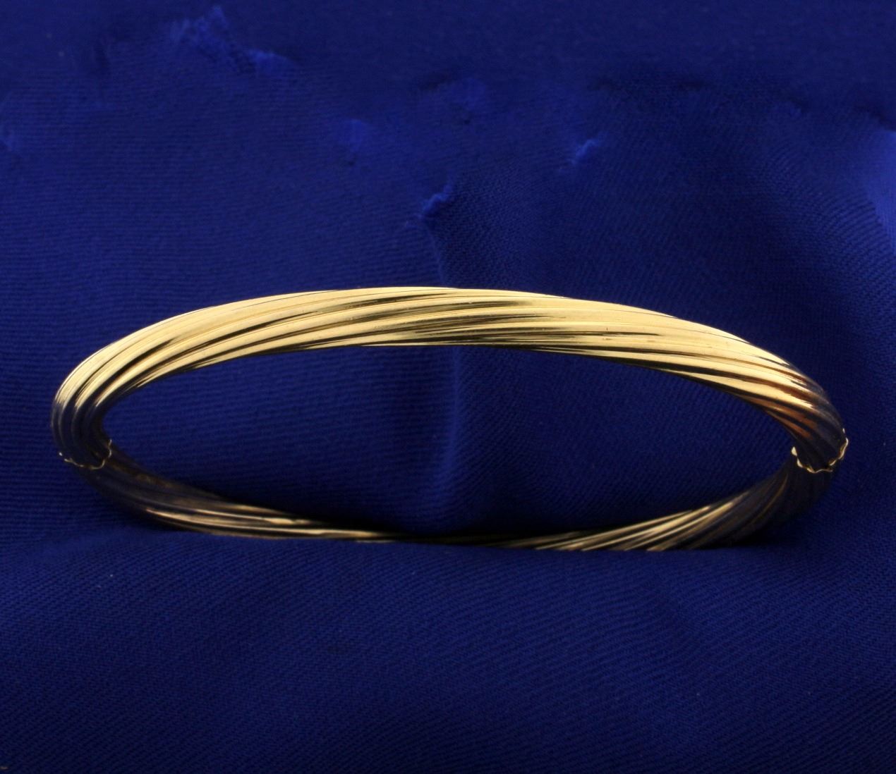 In 18k yellow gold, hinge opening with push button clasp. 2 1/2 inch inside diameter. 16.2g.