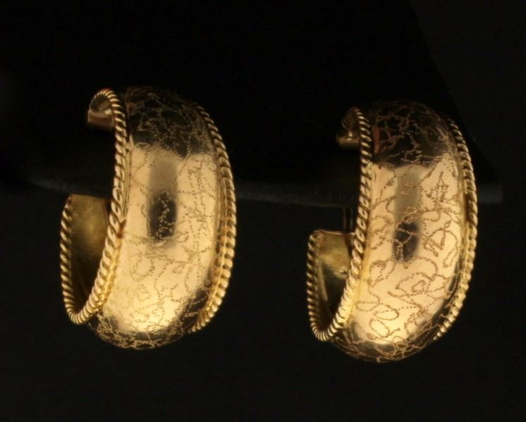 In 18k yellow gold, beaded edges. 7/8 inch long. 5.2g.