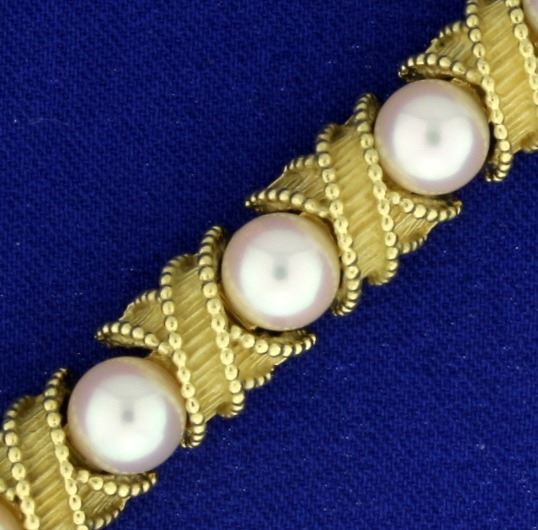 In 18k yellow gold. Contains fourteen 7.5mm high quality natural akoya pearls with excellent mirror like luster. 7" long. 47.6g.
