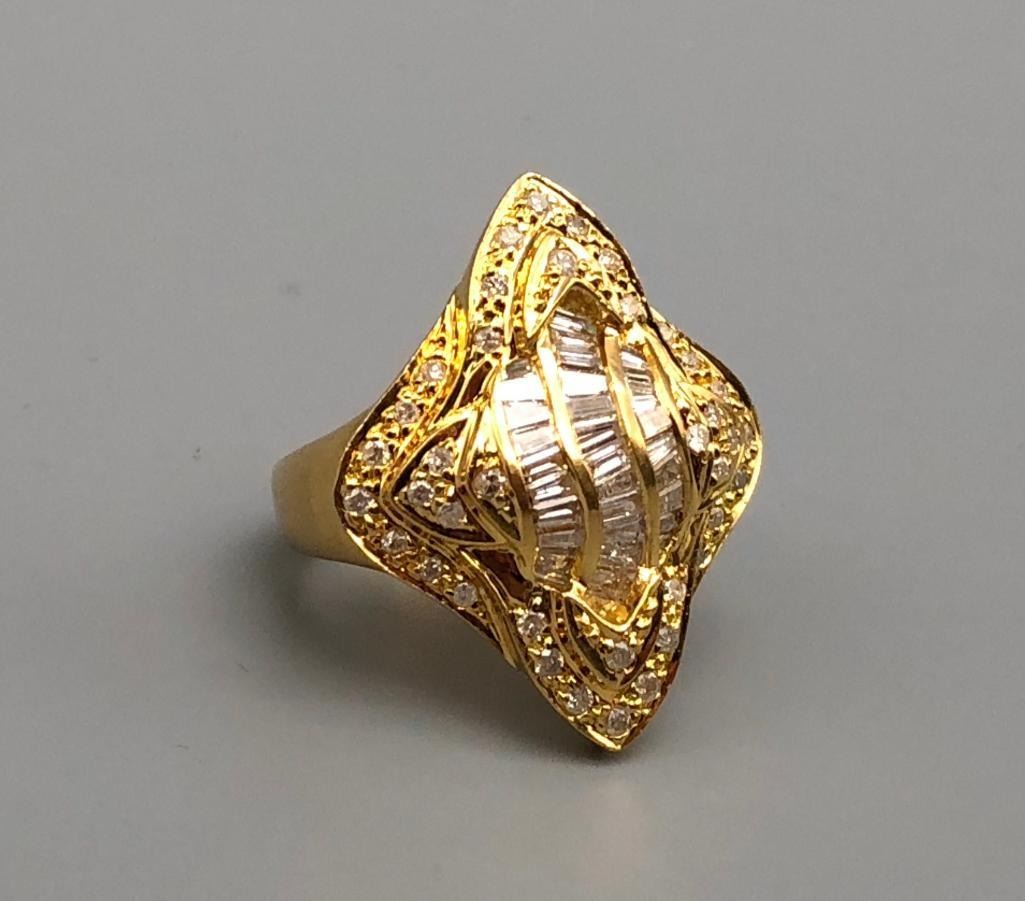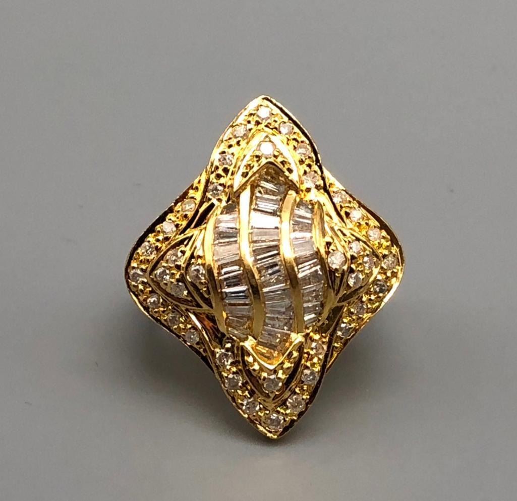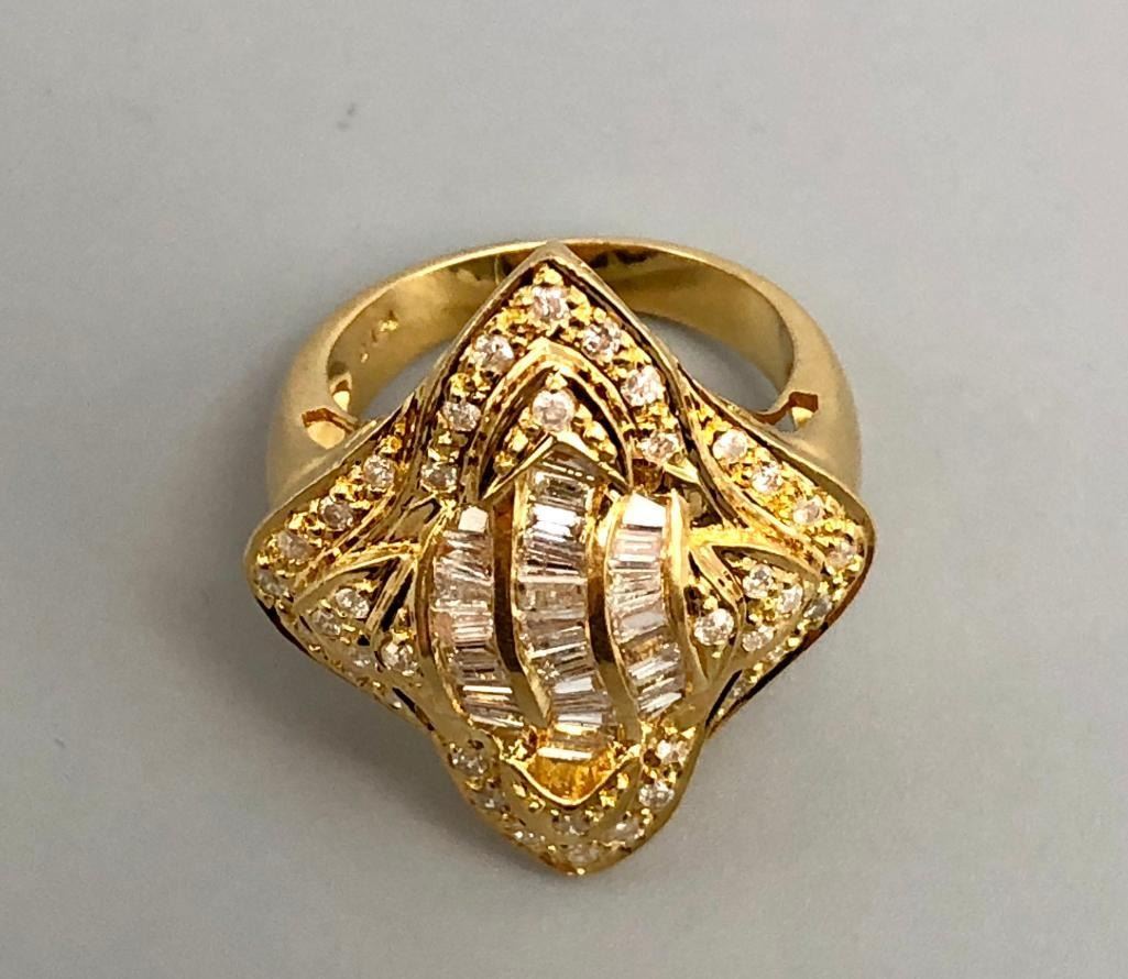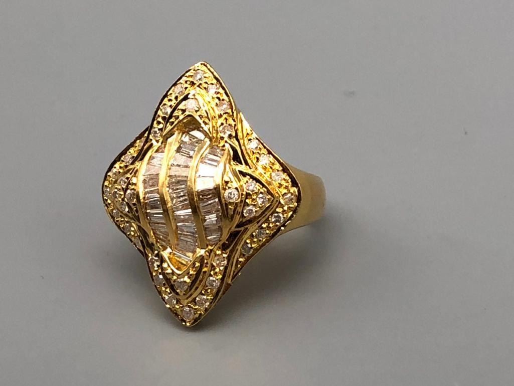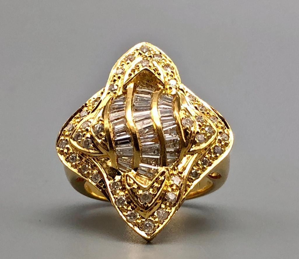 Offered for sale in this lot is a 18k gold and diamond ring. This is a beautiful and unique style ring set with over a carat of diamonds. It is a very classy style ring and is made from 18k gold. MAKER: Hallmarked. APPROX AGE: Fairly modern. SIZE: Fits a size 7. 1-1/8 inches long. Weighs 12.6 grams. CONDITION: Good for its age, normal wear expected. Please look closely at the pictures as they are an important part of our description and are hereby incorporated into the description, specifically with regards to condition. SHIPPING: There will be a $5 handling / packaging fee for shipping this lot. The actual cost of postage will be added on top of that. BUY IT NOW: If you would like to buy this item now, without waiting for the auction day to bid on it, we do offer this option (which is available up to 48 hours before the actual auction starts). The “Buy it Now†price is the high estimate of this lot (plus applicable fees and the Buyer's premium is discounted to 10% when using the Buy it Now option). If you would like to exercise this option, you must contact us by email (or phone as long as you talk to someone live). Reference this lot number and your intention to "Buy it Now."