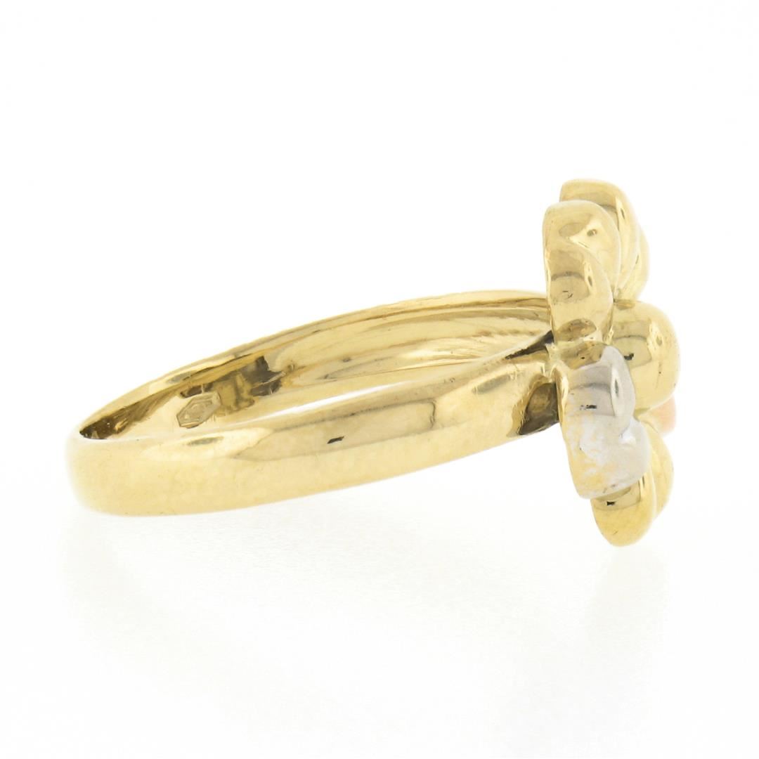 A solid 18k yellow, rose & white gold flower ring. The ring is size 6.0, weighs a total of 3.63 grams, and measures 12.1mm wide.