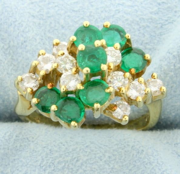In 18K yellow gold, this ring contains seven 1/4ct round high quality natural emerald gemstones with excellent color and clarity. Also contains ten .08ct round high quality diamonds, VS clarity and G/H color. Size 6 1/2 6.6g