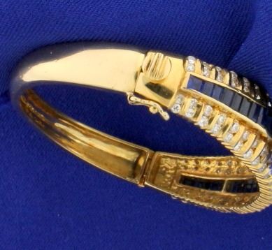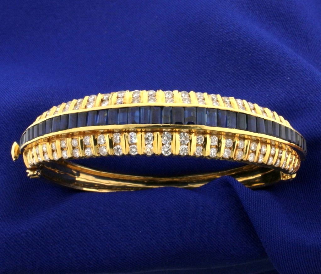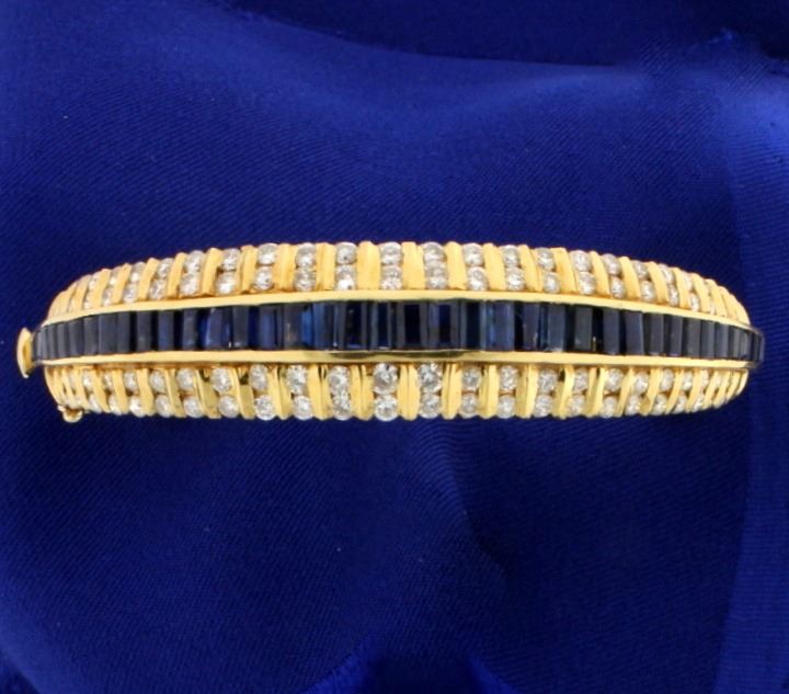 In 18k yellow gold, contains 3ct TW of high quality round brilliant diamonds of VS clarity/G color. Also contains forty baguette shaped high quality natural sapphires ranging from 2.5mm to 4mm long each. Sapphires have excellent deep blue color and excellent clarity. Bracelet hinges open for easy putting on/taking off. With safety clasp. 2 3/8 inch inside diameter. 35.7g.