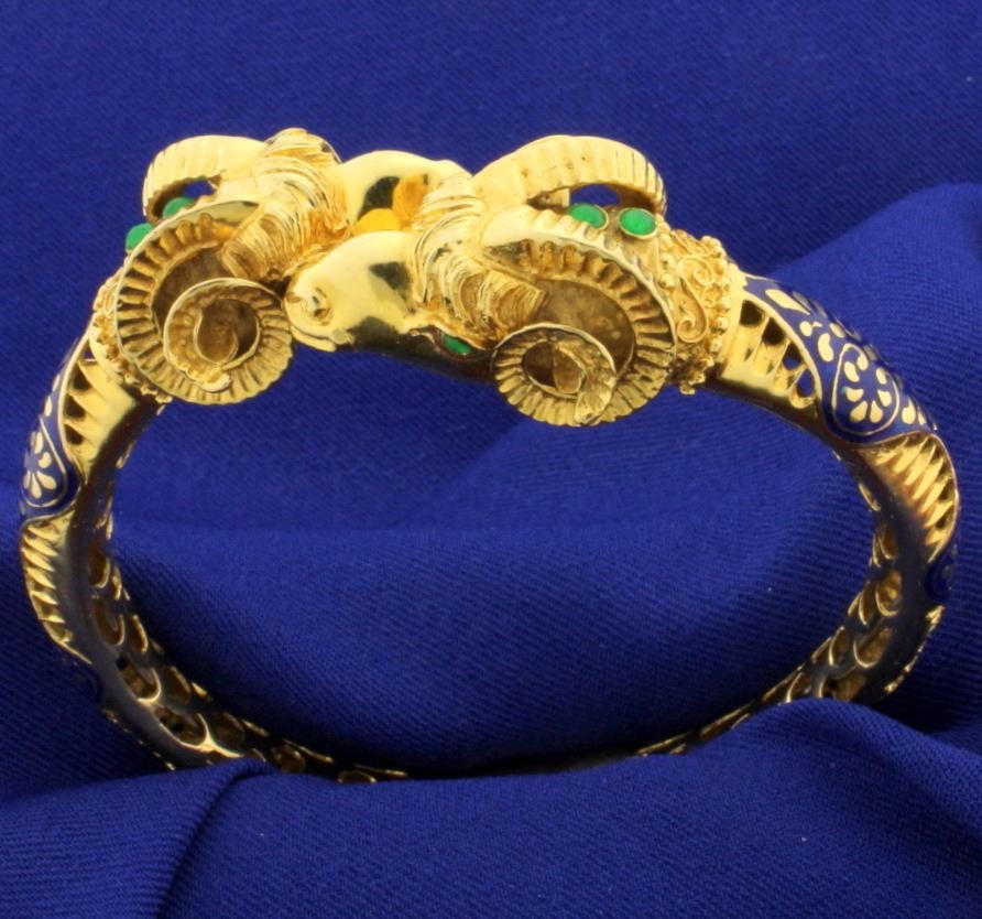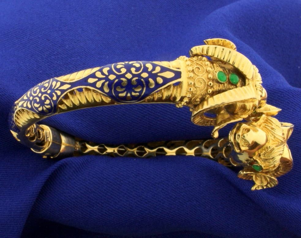 In 18k yellow gold, containing eight Cabochon 2.5mm natural emeralds. Fine enamel work around bracelet. Hinges open to put on/take off. 2 3/8 inch inside diameter. 34.6g.