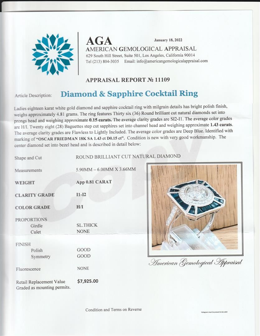 18k Sapphire and Diamond Ring .81ct. Please see Photos and Description for all available information. This vintage style engagement ring is made with a shiny 18k white gold band with a 0.81ct round cut diamond surrounded by a halo of round cut diamonds and shiny blue sapphires. The ring is unique and glimmers with its vintage appeal.