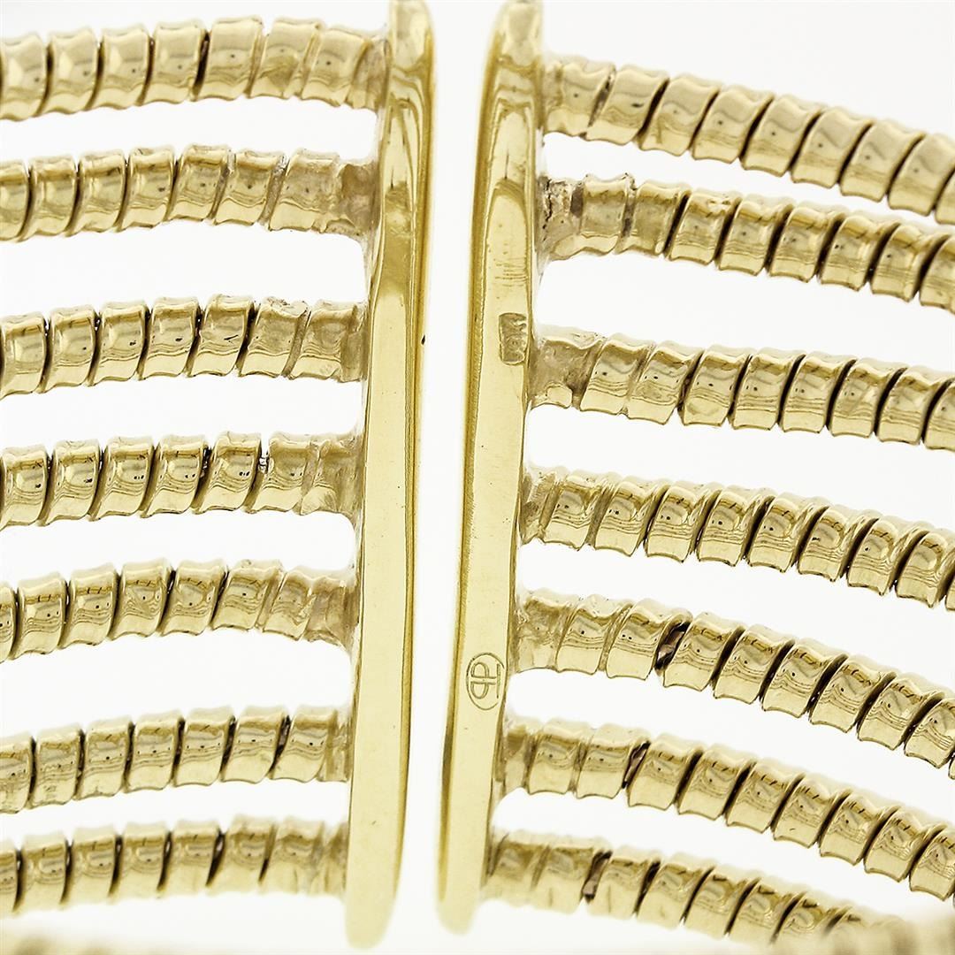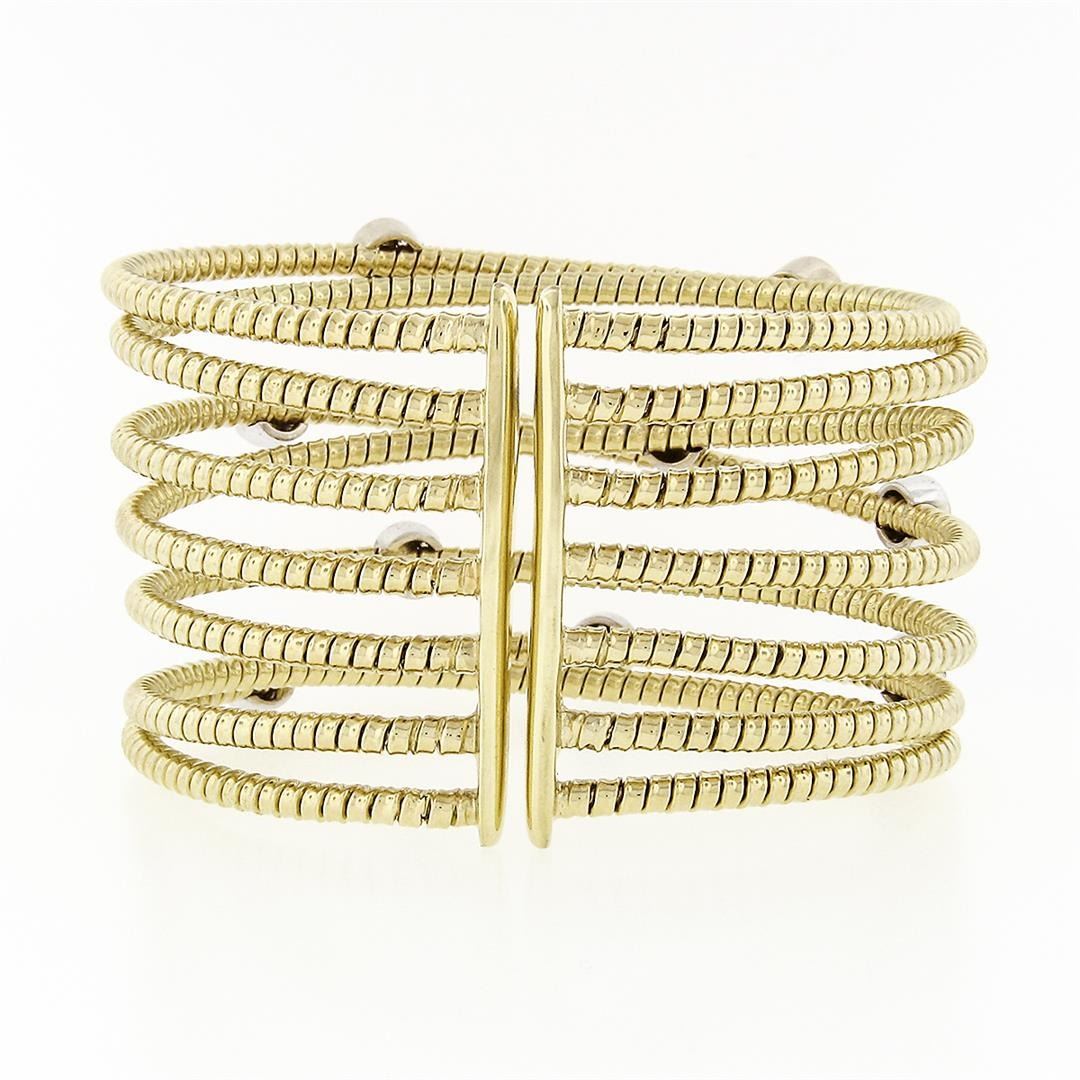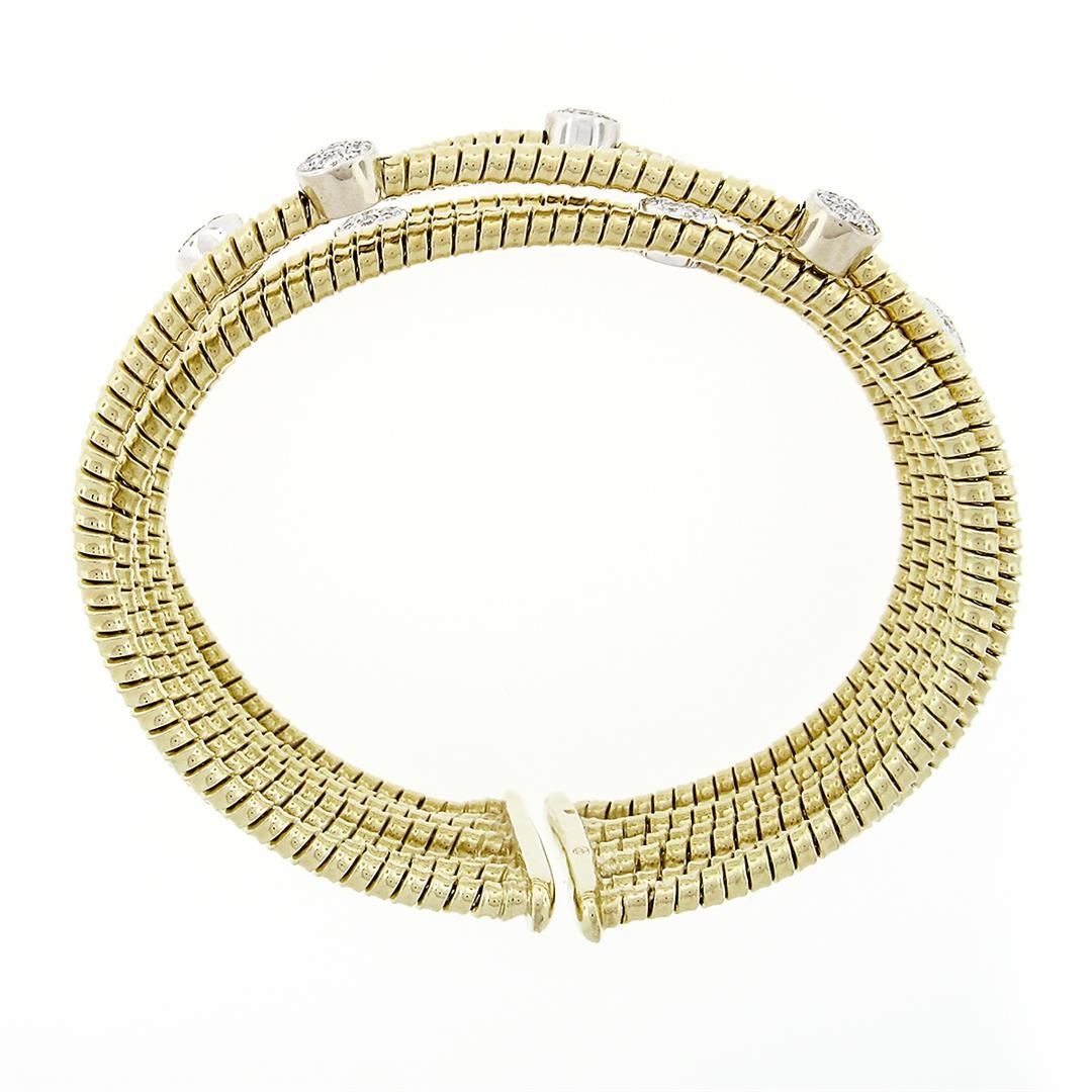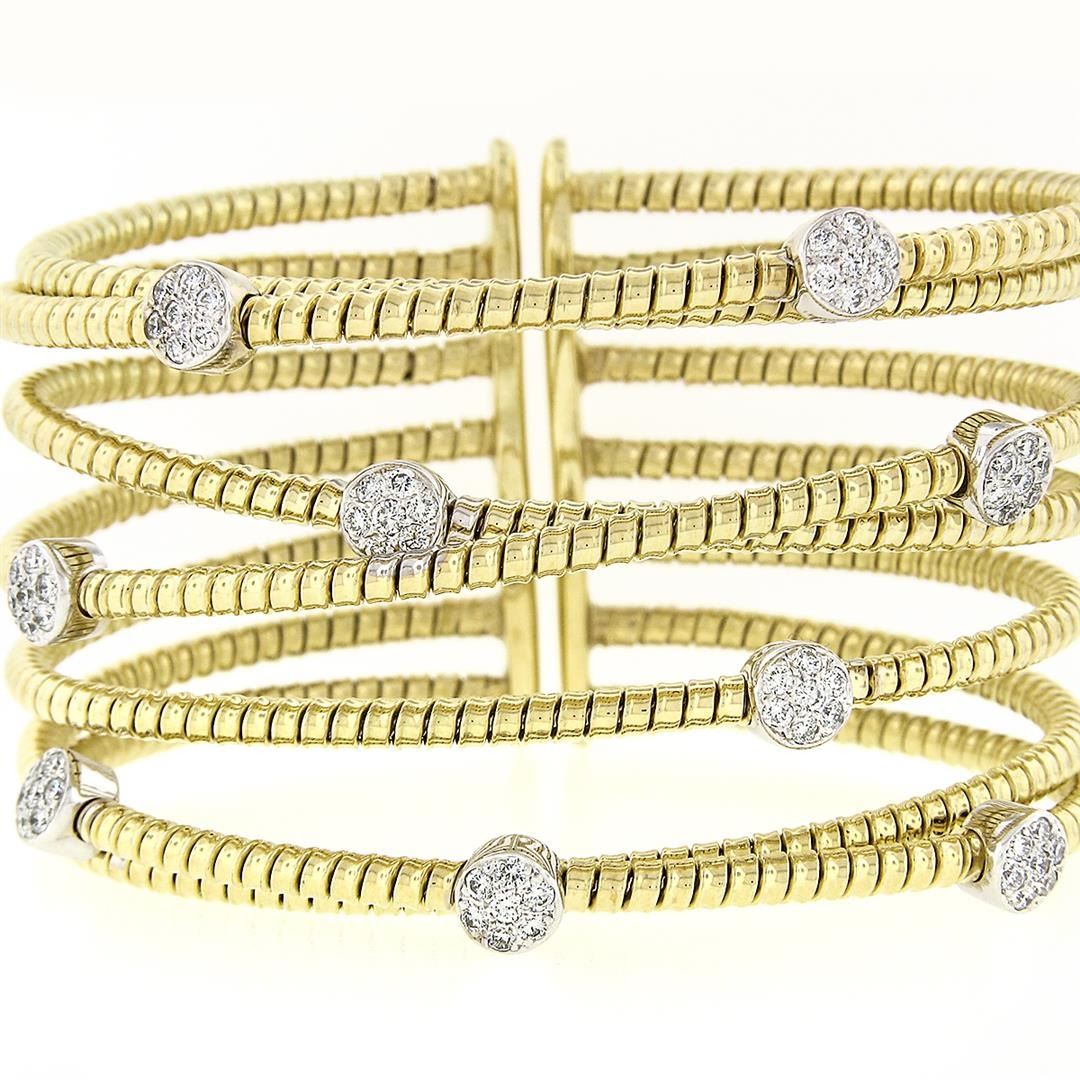 A solid 18k yellow gold wide cuff flexible open bracelet, with 63 round brilliant cut natural diamonds (F/G- VS1/VS2; 1.35ctw). It weighs a total of 67.40 grams, measures 5.9mm wide, and measures 6 inches in length.