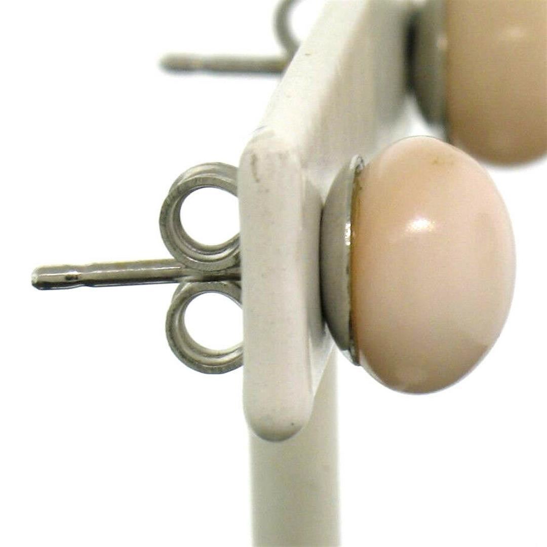A simple pair of solid 18k white gold stud earrings featuring a pair of round button-shaped angel skin coral stones (8.6mm). The earrings measure approximately 8.6mm in diameter and weigh a total of 2.20 grams.