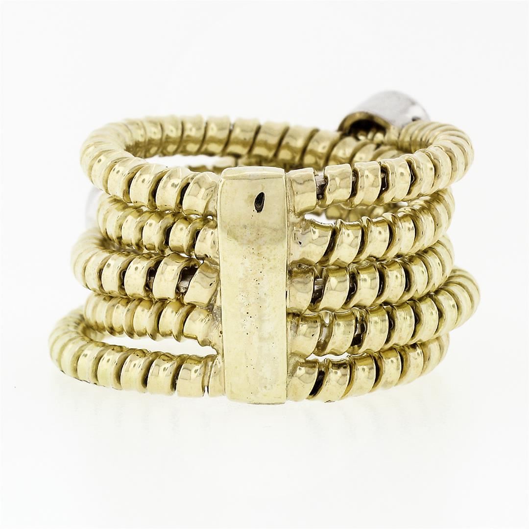 A solid 18k yellow & white gold multi crossover wide band ring, with 21 round brilliant cut natural diamonds (F/G - VS1/VS2 ; 0.42ctw). The ring is size 6, weighs a total of 16.71 grams, and measures 15.5mm wide.