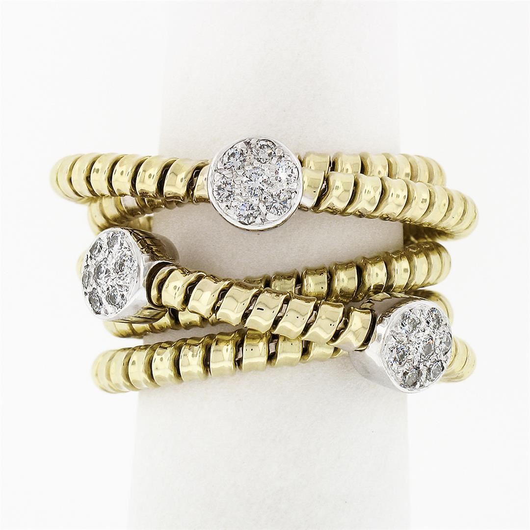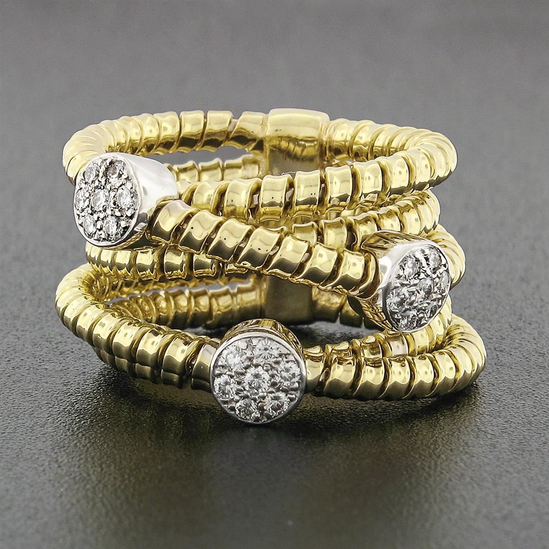 A solid 18k yellow & white gold multi crossover wide band ring, with 21 round brilliant cut natural diamonds (F/G - VS1/VS2 ; 0.42ctw). The ring is size 6, weighs a total of 16.71 grams, and measures 15.5mm wide.