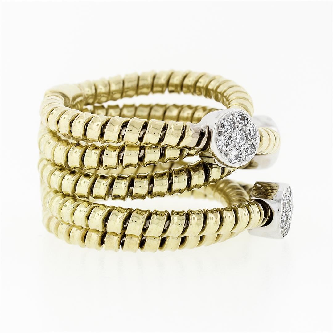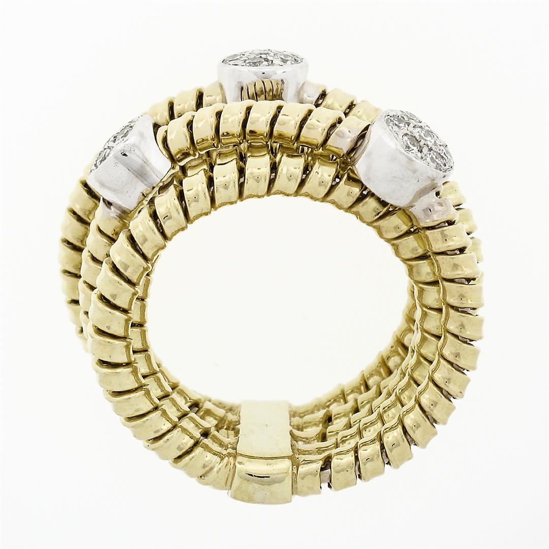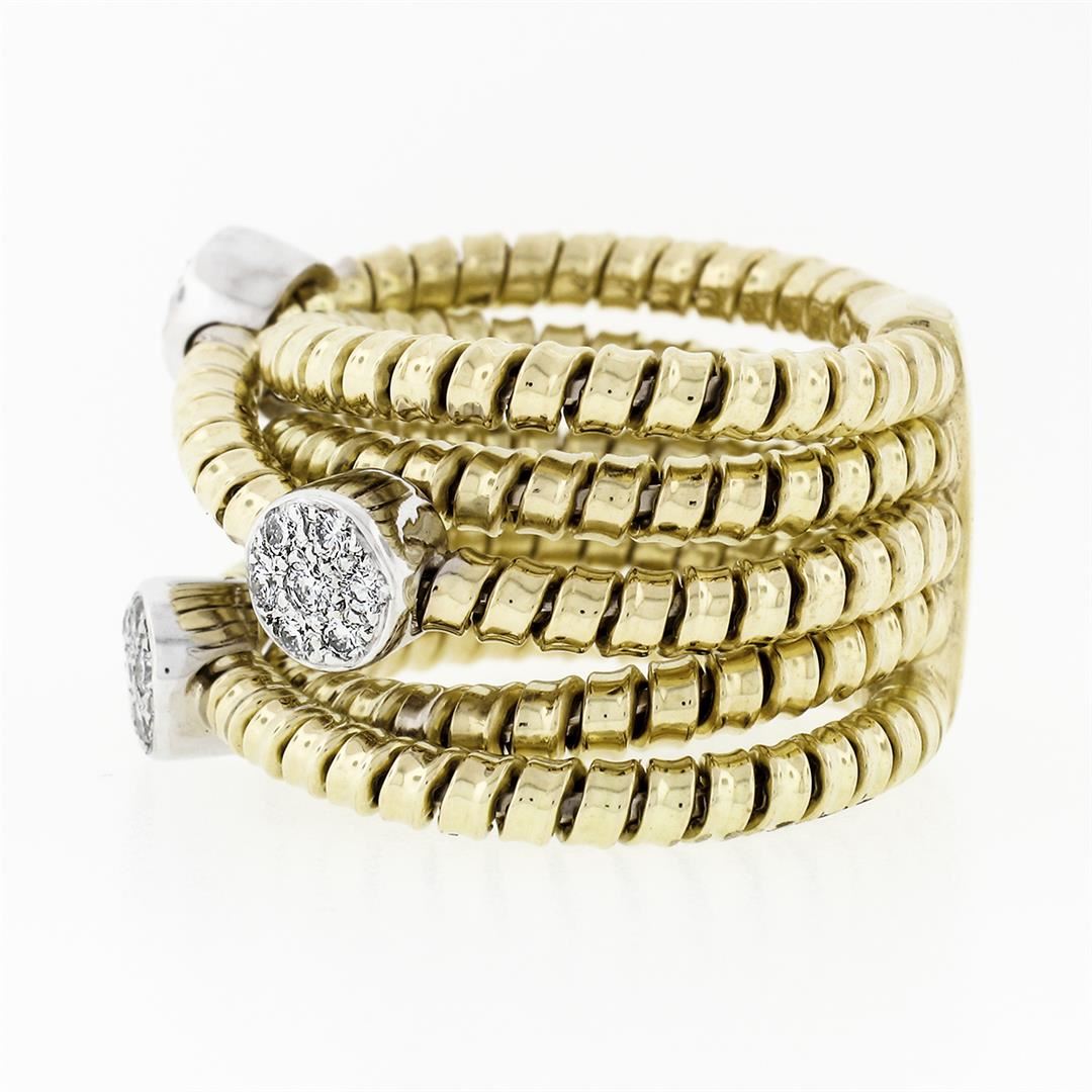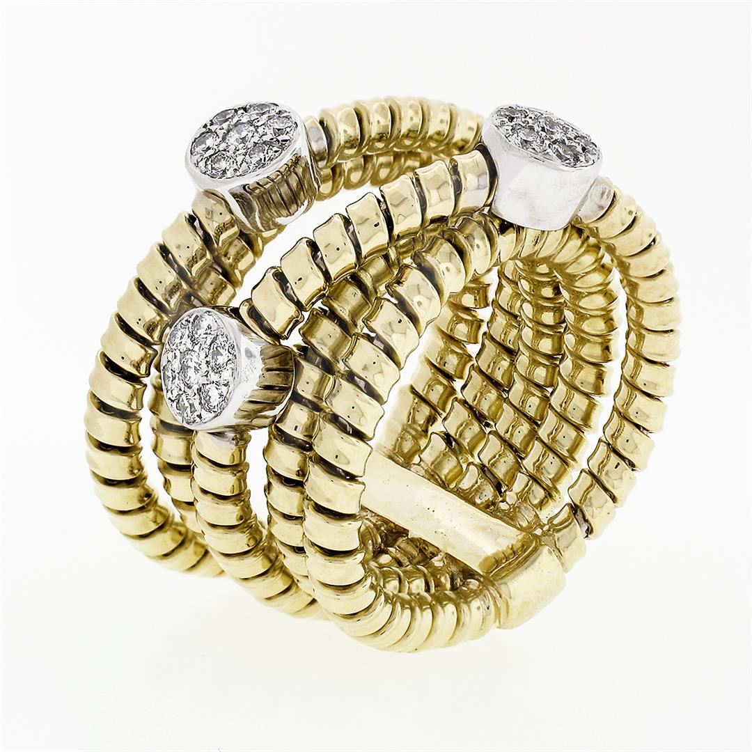 A solid 18k yellow & white gold multi crossover wide band ring, with 21 round brilliant cut natural diamonds (F/G - VS1/VS2 ; 0.42ctw). The ring is size 6, weighs a total of 16.71 grams, and measures 15.5mm wide.