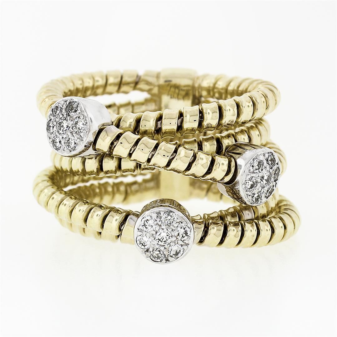 A solid 18k yellow & white gold multi crossover wide band ring, with 21 round brilliant cut natural diamonds (F/G - VS1/VS2 ; 0.42ctw). The ring is size 6, weighs a total of 16.71 grams, and measures 15.5mm wide.