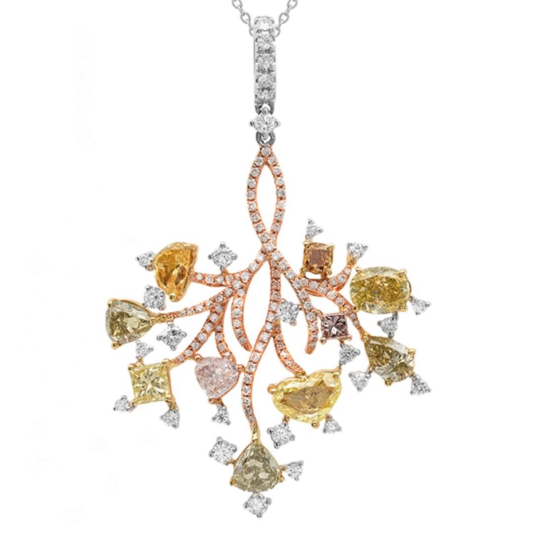 One 18k Three Tone Gold 4.77CTW Diamond, Pink Diamond and Multicolor Dia Pendant, (VS2/VS1/Pink/Fan/F) - Product Specification: Stone: Diamond Stone 2: Pink Diamond Stone 2 Clarity: VS2 Stone 2 Color: PINK Stone 2 Weight: 0.35 Stone 3 Clarity: VS2 Stone 3 Color: FAN Stone 3 Custom: Women Stone 3 Weight: 3.59 Stone 4 Custom: VS1 / F Stone Clarity: VS1 Stone Color: F Stone Weight: 0.83 Weight: 1 Width: 32.0mm