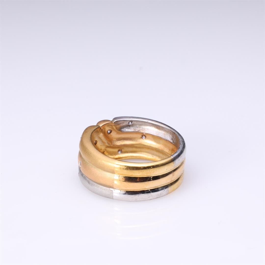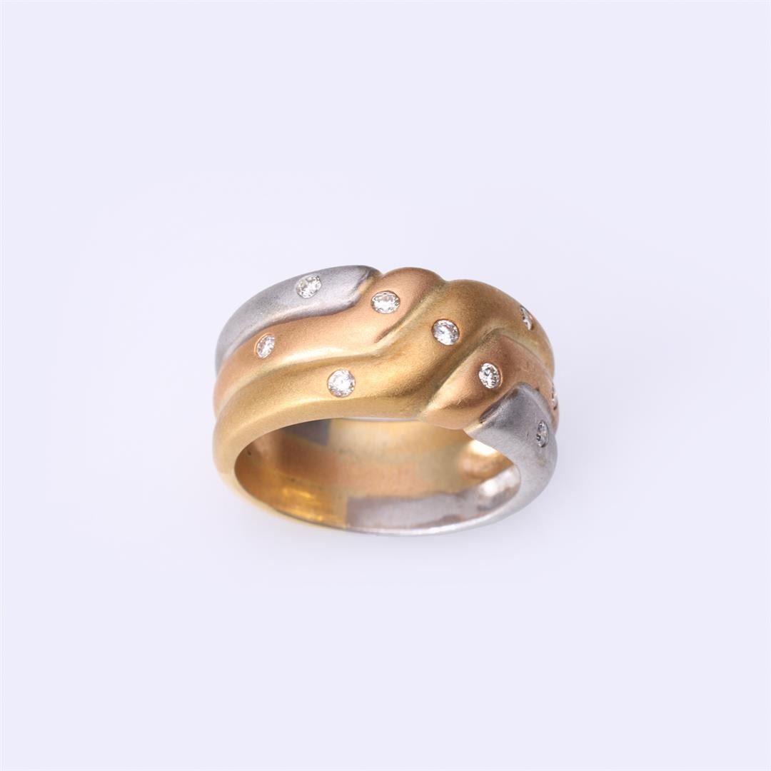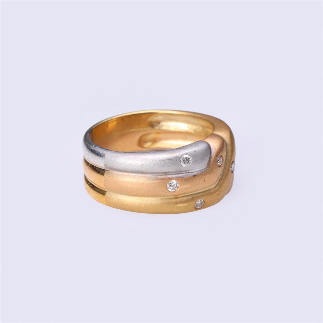 18k tricolor gold ring with yellow, white and rose gold bands corssing over, each diamond accents, marked 750 to interior band; gross weight 11.2 g, size 7