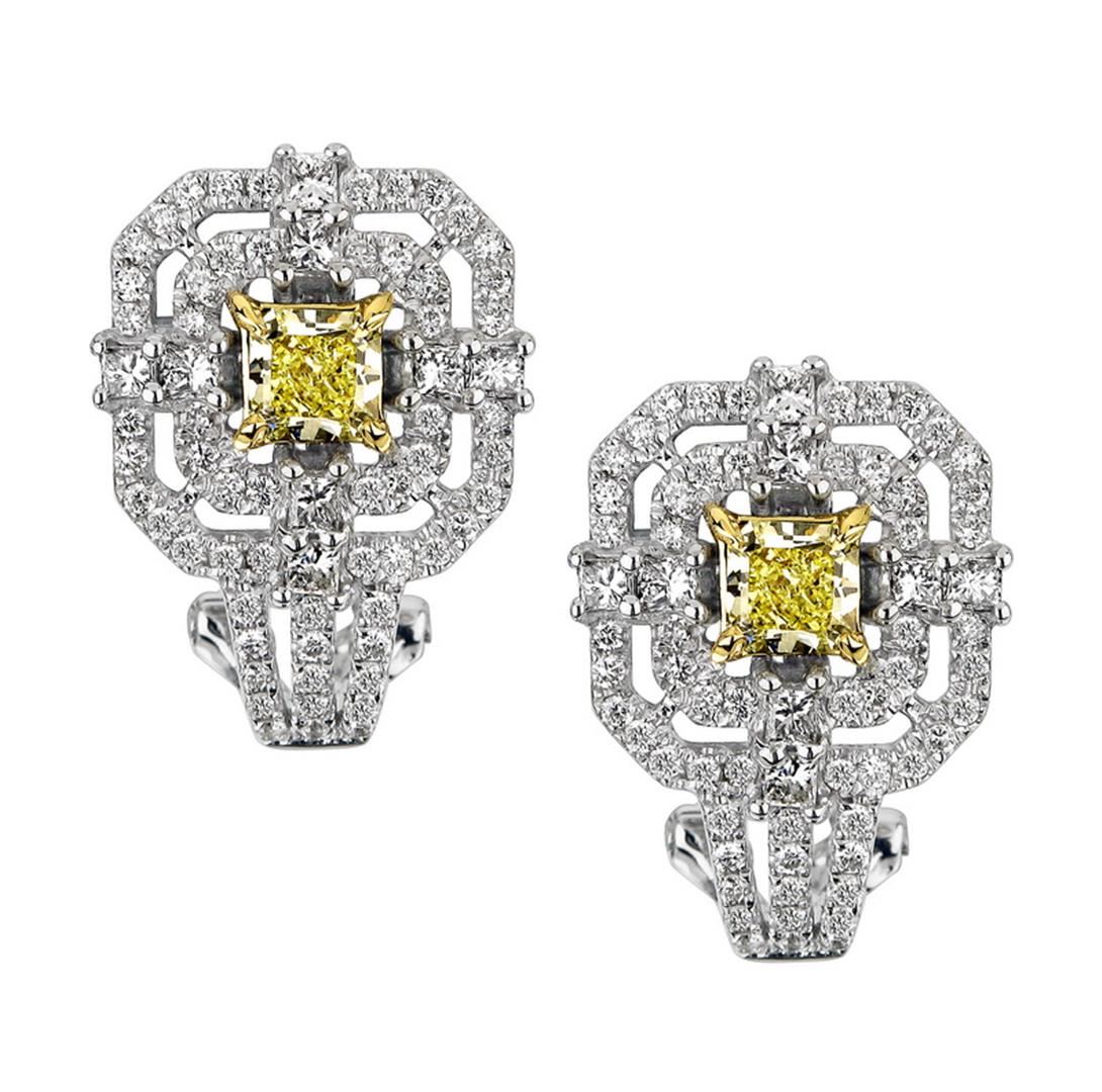 One 18k Two Tone Gold 1.85CTW Diamond Earring, (VS1-SI1/SI1/VS2 /G-H/G /Nat-yel) - Product Specification: Stone: Diamond Stone 2 Clarity: VS1-SI1 Stone 2 Color: G-H Stone 2 Custom: 16 Stone 2 Shape: Princess Stone 2 Type: Diamond Stone 2 Weight: 0.54 Stone 3: Diamond Stone 3 Clarity: SI1 Stone 3 Clarity min: SI1 Stone 3 Color: G Stone 3 Weight: 0.59 Stone 4 Custom: VS2 / NAT-YEL Stone Clarity: VS2 Stone Color: Nat-yel Stone Color to: YEL Stone type: Radiant Stone Weight: 0.72 Weight: 1 Width: 13.0mm