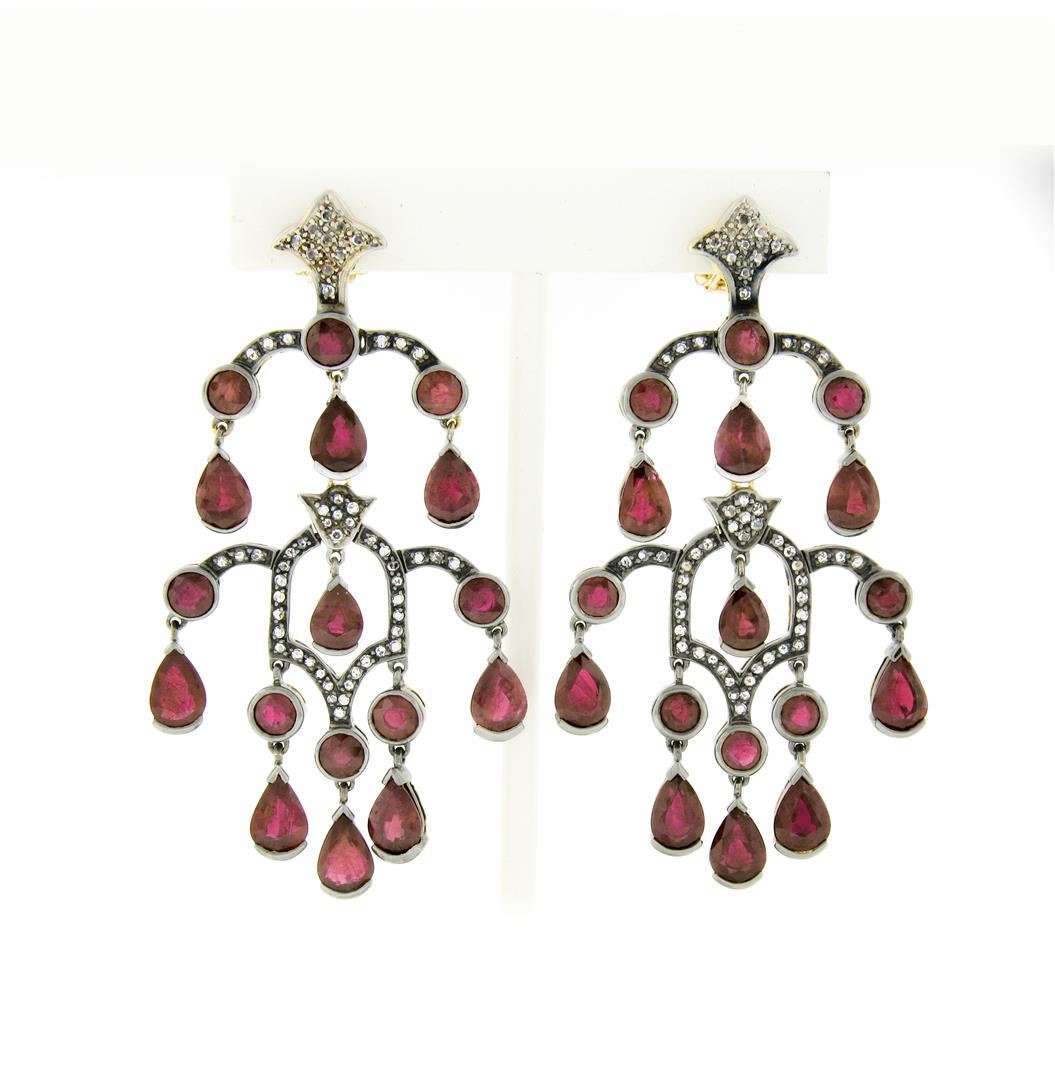 A pair of solid 18k yellow and black gold chandelier earrings, with 18 Gia certified pear cut natural rubies (11.0ctw), and 16 round brilliant cut natural rubies (4.80ctw), with 112 rose cut natural diamonds (H/I - VS2/SI1 ; 1.68ctw ). The earrings measure approximately 62.75x33.10mm and weigh a total of 25.45 grams. Comes with all original relevant certifications.