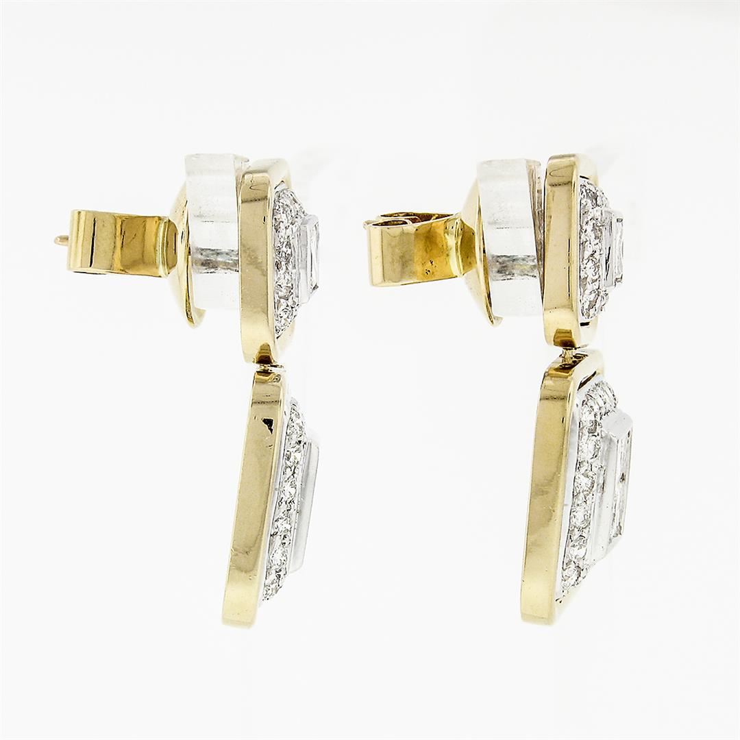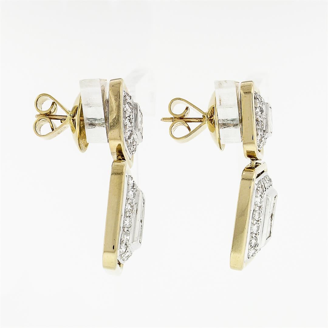 A solid 18k two tone dual square dangle drop earrings, with 10 square princess cut natural diamonds (G/H - VS1/VS2 ; 2.8ctw), surrounded with a halo of 64 round brilliant cut natural diamonds (G/H - VS1/VS2 ; 0.80ctw). The earrings measure approximately 27.56x15.56mm and weigh a total of 16.43 grams.