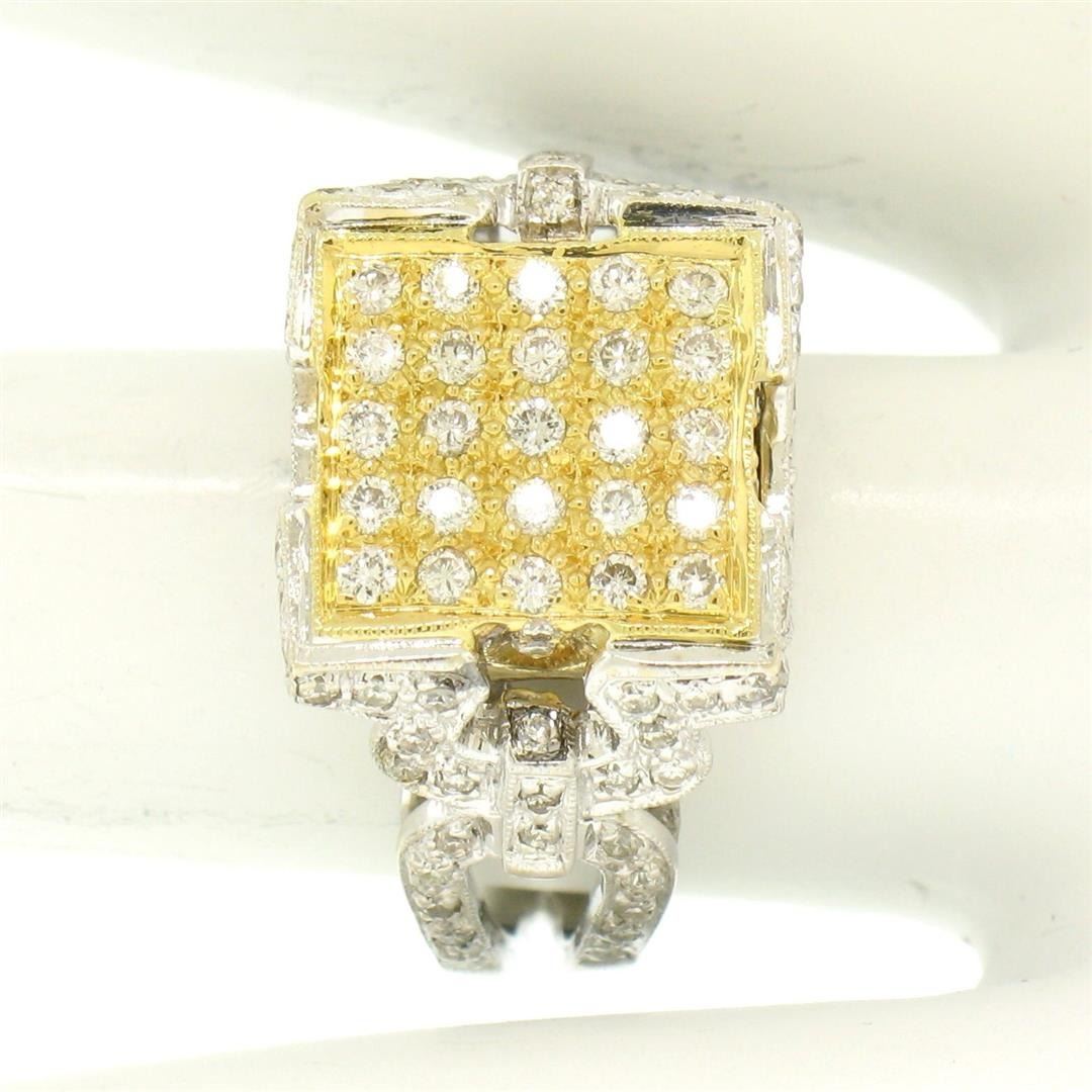 An estate solid 18k yellow and white gold square cocktail ring, with 109 round brilliant cut natural diamonds (F/G - VS1/VS2 ; 1.10ctw). The ring is size 6.5, weighs a total of 9.5 grams, and measures 13.0mm wide.