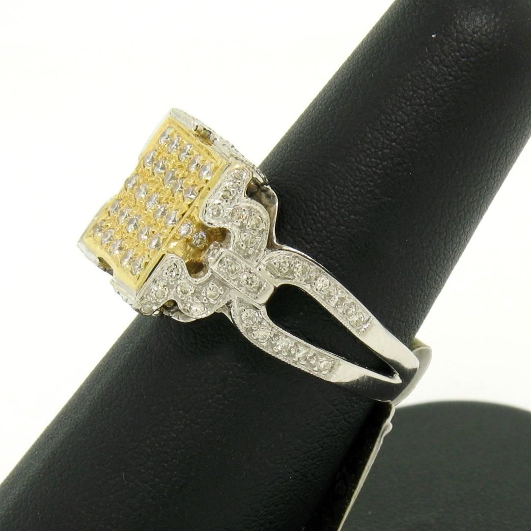 An estate solid 18k yellow and white gold square cocktail ring, with 109 round brilliant cut natural diamonds (F/G - VS1/VS2 ; 1.10ctw). The ring is size 6.5, weighs a total of 9.5 grams, and measures 13.0mm wide.