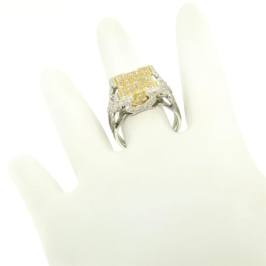 An estate solid 18k yellow and white gold square cocktail ring, with 109 round brilliant cut natural diamonds (F/G - VS1/VS2 ; 1.10ctw). The ring is size 6.5, weighs a total of 9.5 grams, and measures 13.0mm wide.