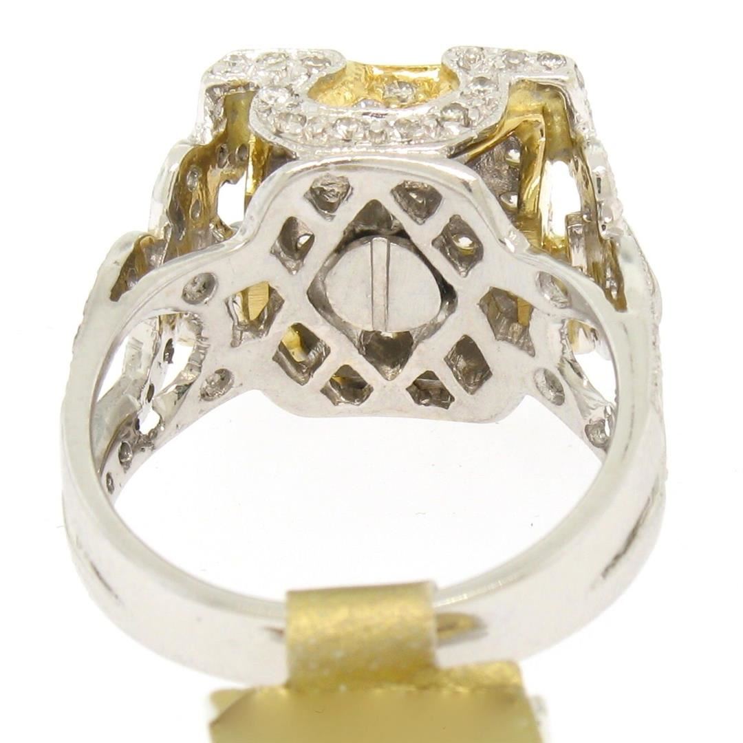 An estate solid 18k yellow and white gold square cocktail ring, with 109 round brilliant cut natural diamonds (F/G - VS1/VS2 ; 1.10ctw). The ring is size 6.5, weighs a total of 9.5 grams, and measures 13.0mm wide.