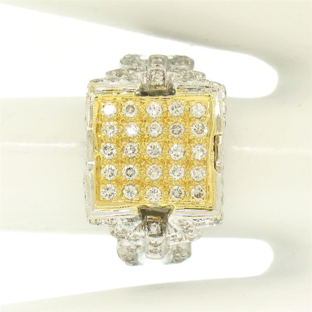 An estate solid 18k yellow and white gold square cocktail ring, with 109 round brilliant cut natural diamonds (F/G - VS1/VS2 ; 1.10ctw). The ring is size 6.5, weighs a total of 9.5 grams, and measures 13.0mm wide.