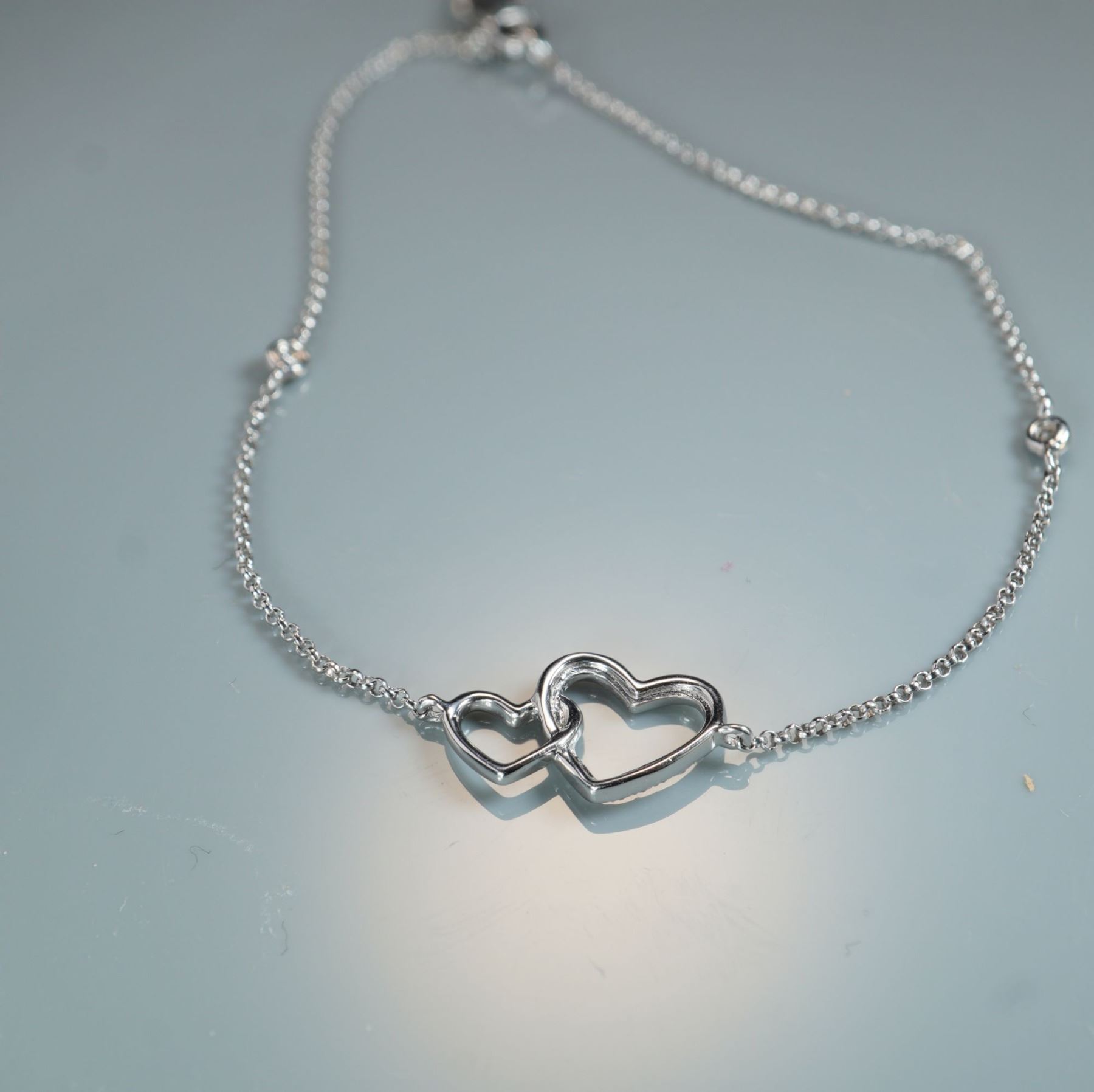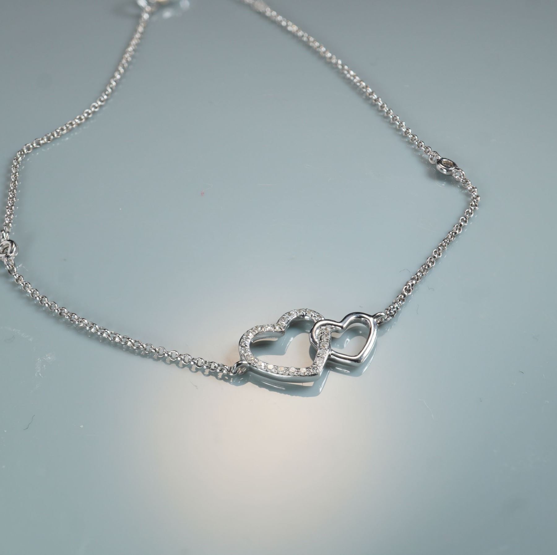 A delicate bracelet crafted in 18k white gold featuring two interlocking open hearts, one adorned with 0.09 carats total weight of round diamonds. The fine chain adds a refined touch and is secured with a lobster clasp. Marked 18k on clasp. Weight: 1.52g.
