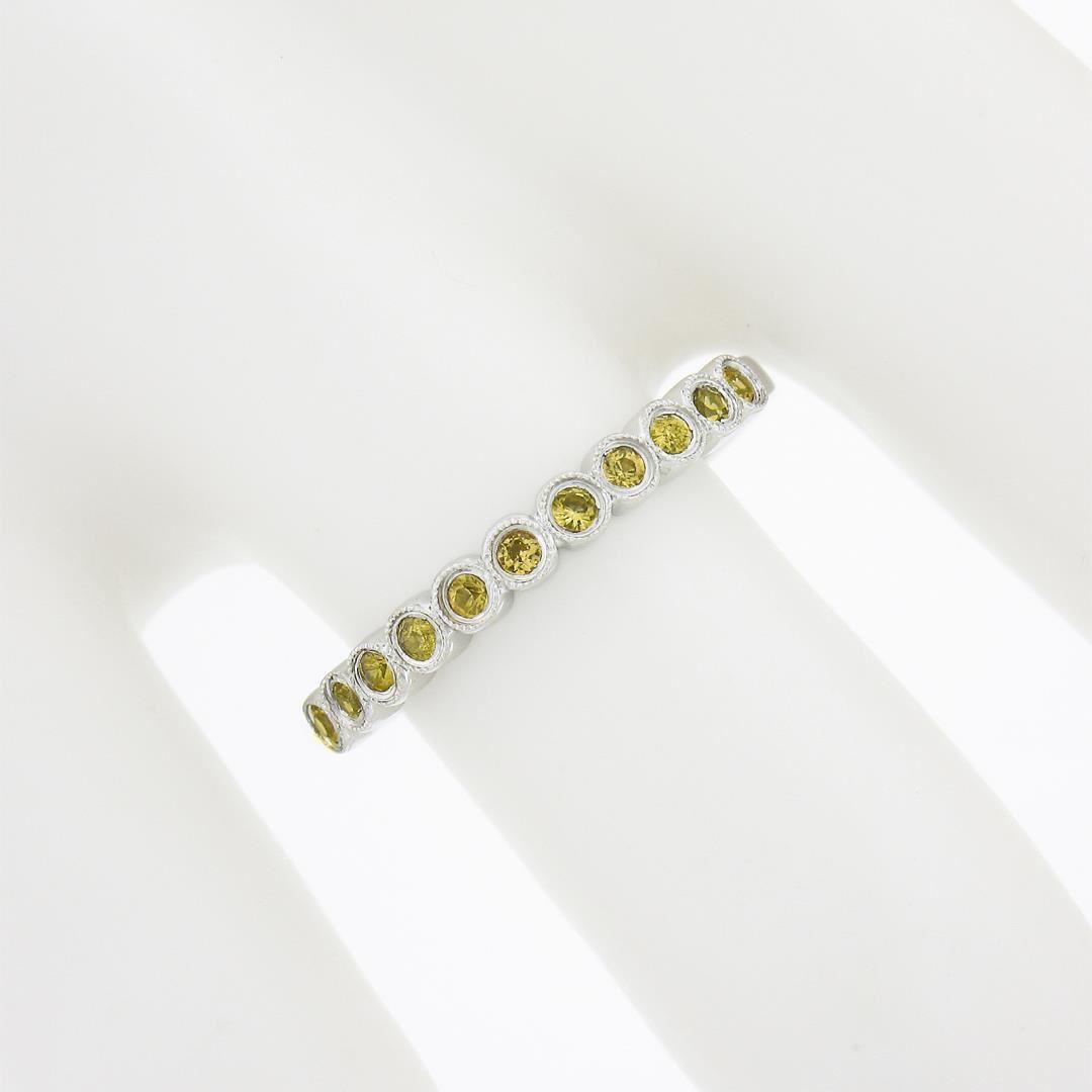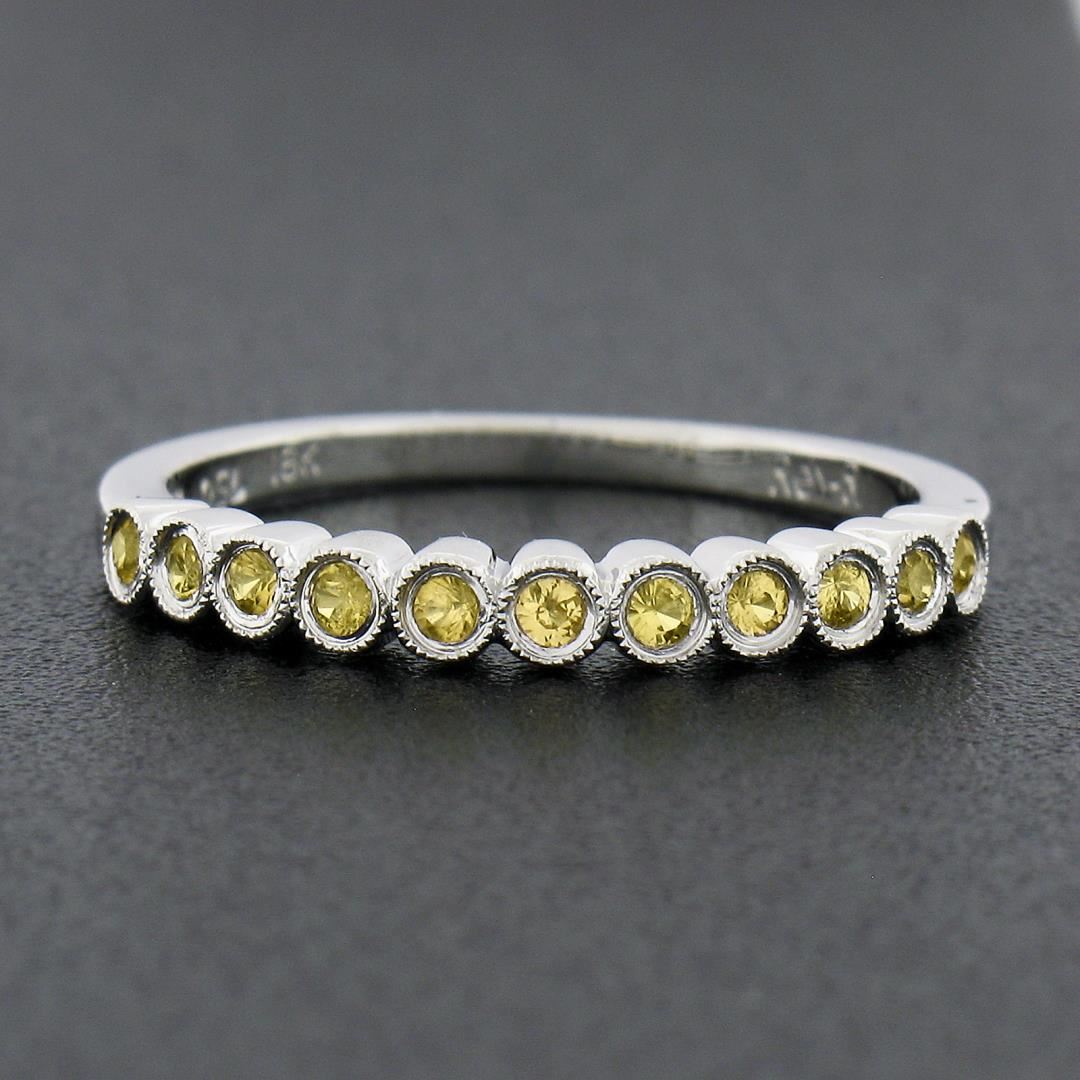 A solid 18k white gold ring, with 11 round cut natural yellow sapphires (0.30ctw). The ring is size 6.5, weighs a total of 2.15 grams, and measures 2.6mm wide.