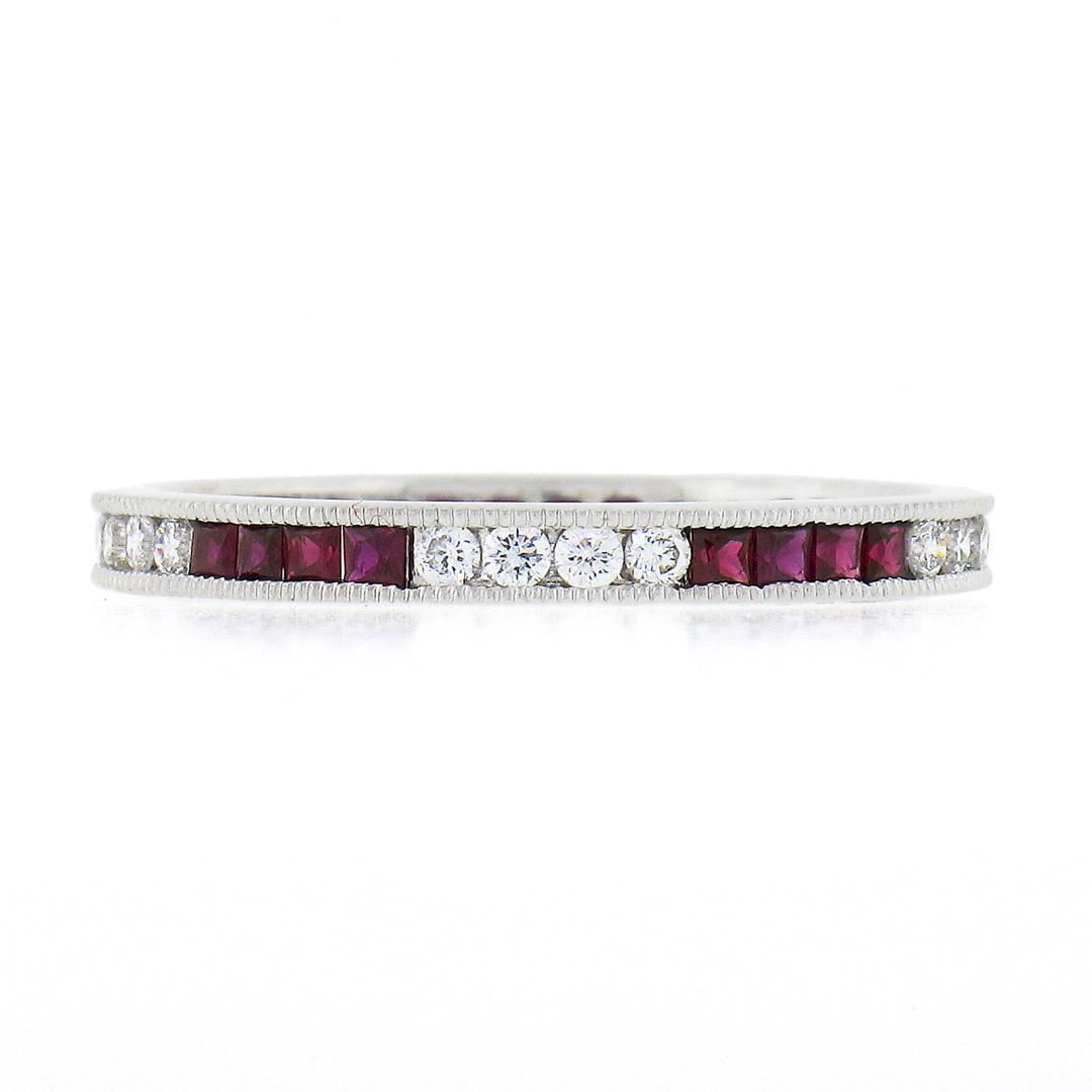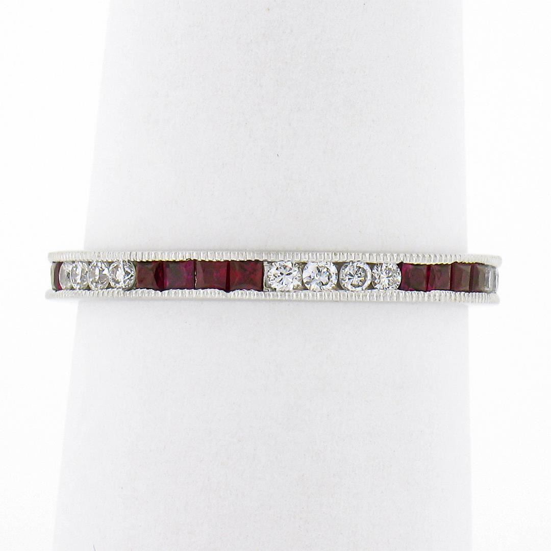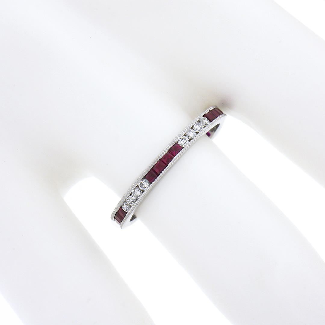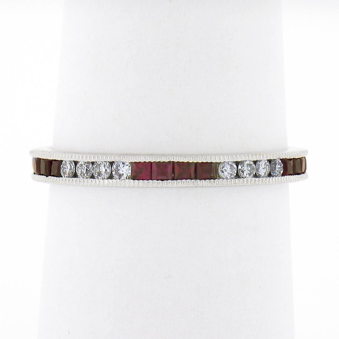 A solid 18k white gold band ring, with 20 square step cut natural rubies (0.45ctw), and 20 round brilliant cut natural diamonds (G/H - VS1 ; 0.25ctw). The ring is size 6.5, weighs a total of 1.50 grams, and measures 2.3mm wide.
