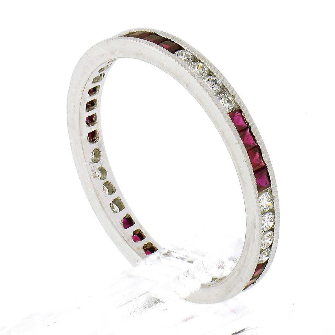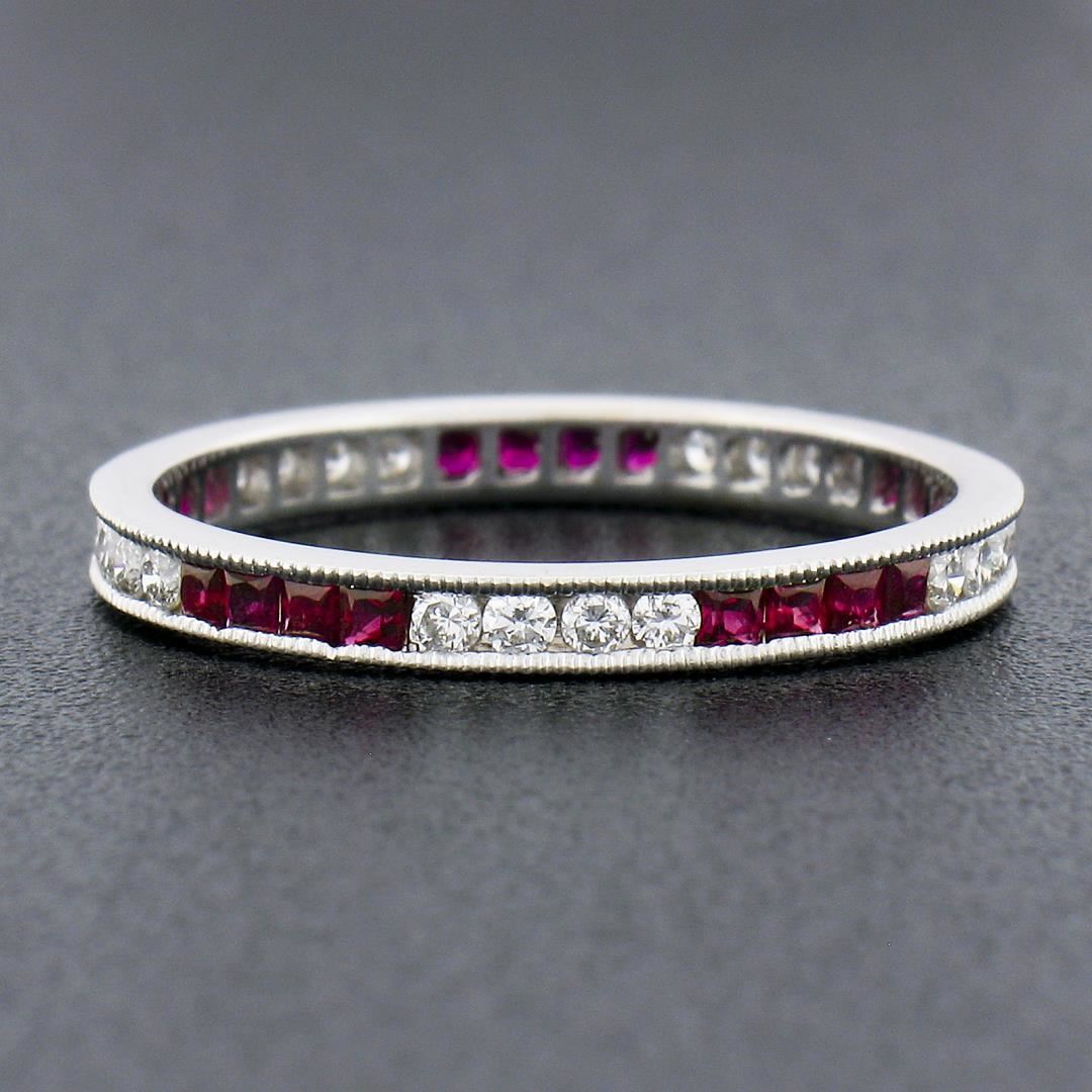 A solid 18k white gold band ring, with 20 square step cut natural rubies (0.45ctw), and 20 round brilliant cut natural diamonds (G/H - VS1 ; 0.25ctw). The ring is size 6.5, weighs a total of 1.50 grams, and measures 2.3mm wide.