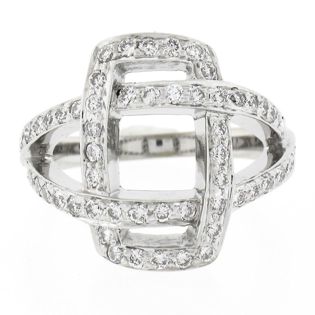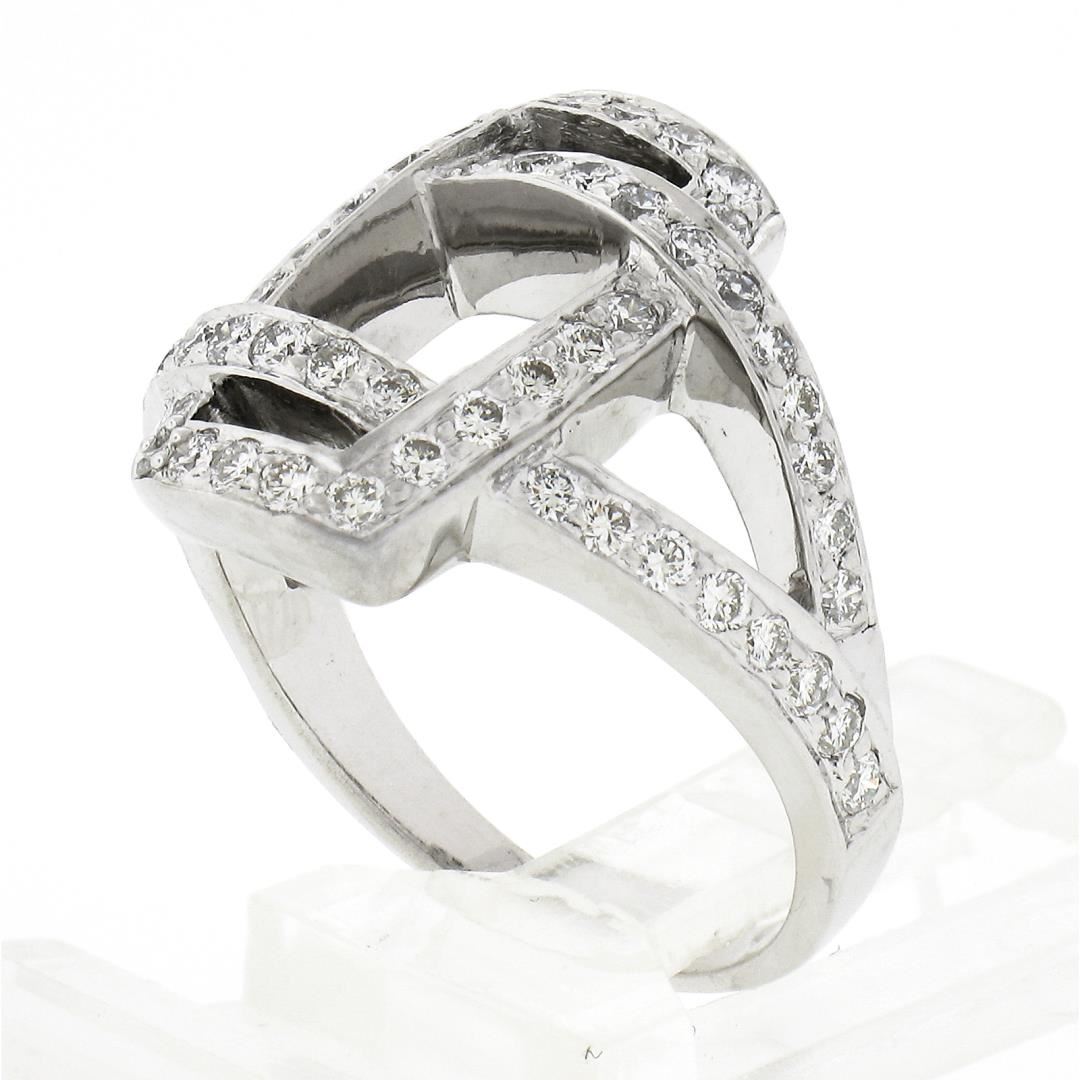 A solid 18k white gold interlocking ring, with 60 round brilliant cut natural diamonds (G/H - VS1/VS2 ; 0.78ctw). The ring is size 6.0, weighs a total of 6.63 grams, and measures 16.70mm wide.