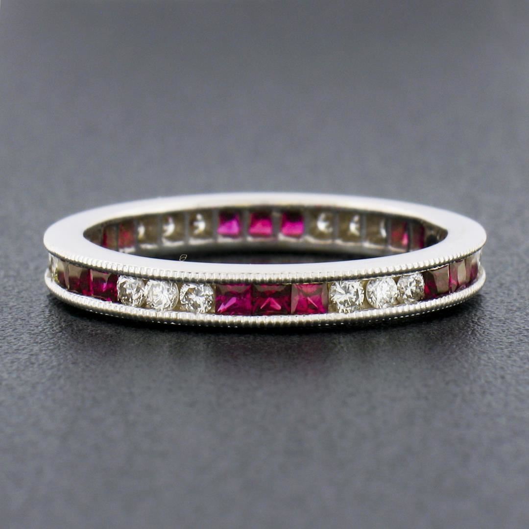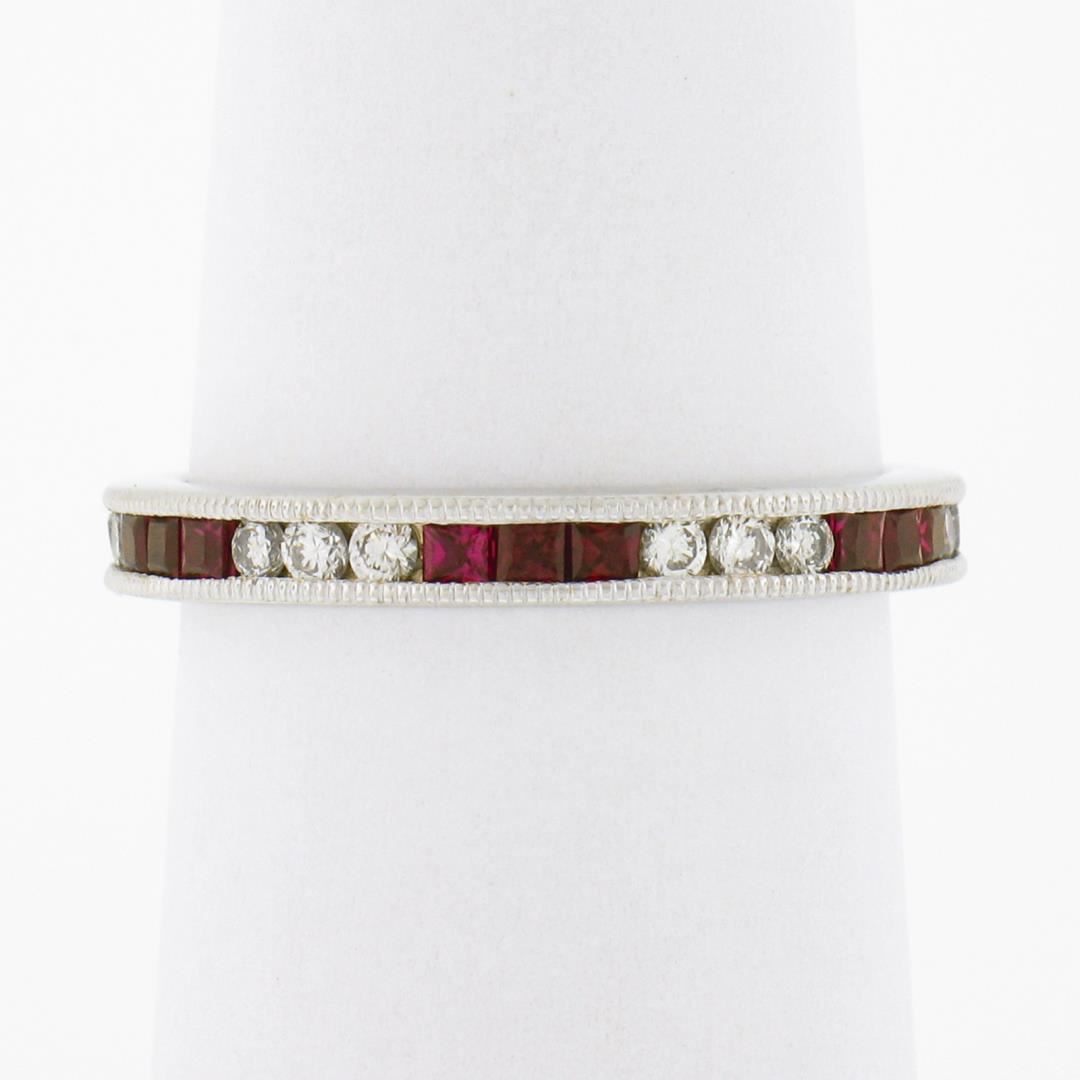 A solid 18k white gold band ring, with 18 square cut natural rubies (0.67ctw), and 18 round brilliant cut natural diamonds (H/I - VS1/VS2 ; 0.35ctw). The ring is size 6.5, weighs a total of 2.60 grams, and measures 2.8mm wide.
