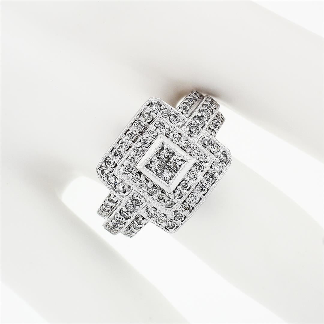 A solid 18k white gold tiered square cluster ring, with 4 square princess cut natural diamonds (G/H - VS2/SI1 ; 0.20ctw), and 90 round brilliant cut natural diamonds (G/H - SI1/SI2 ;1.00ctw). The ring is size 6.0, weighs a total of 13.26 grams, and measures 14.06mm wide.