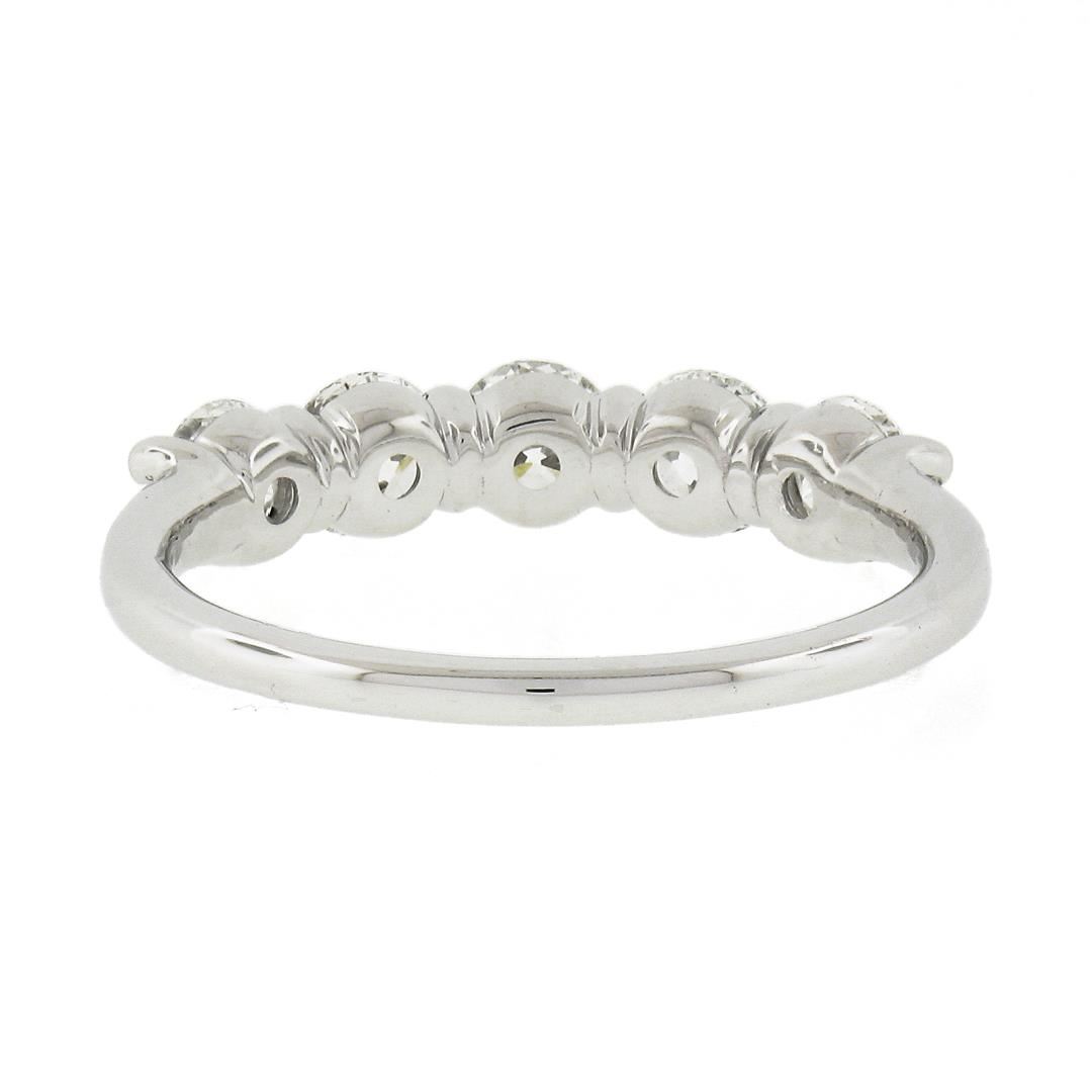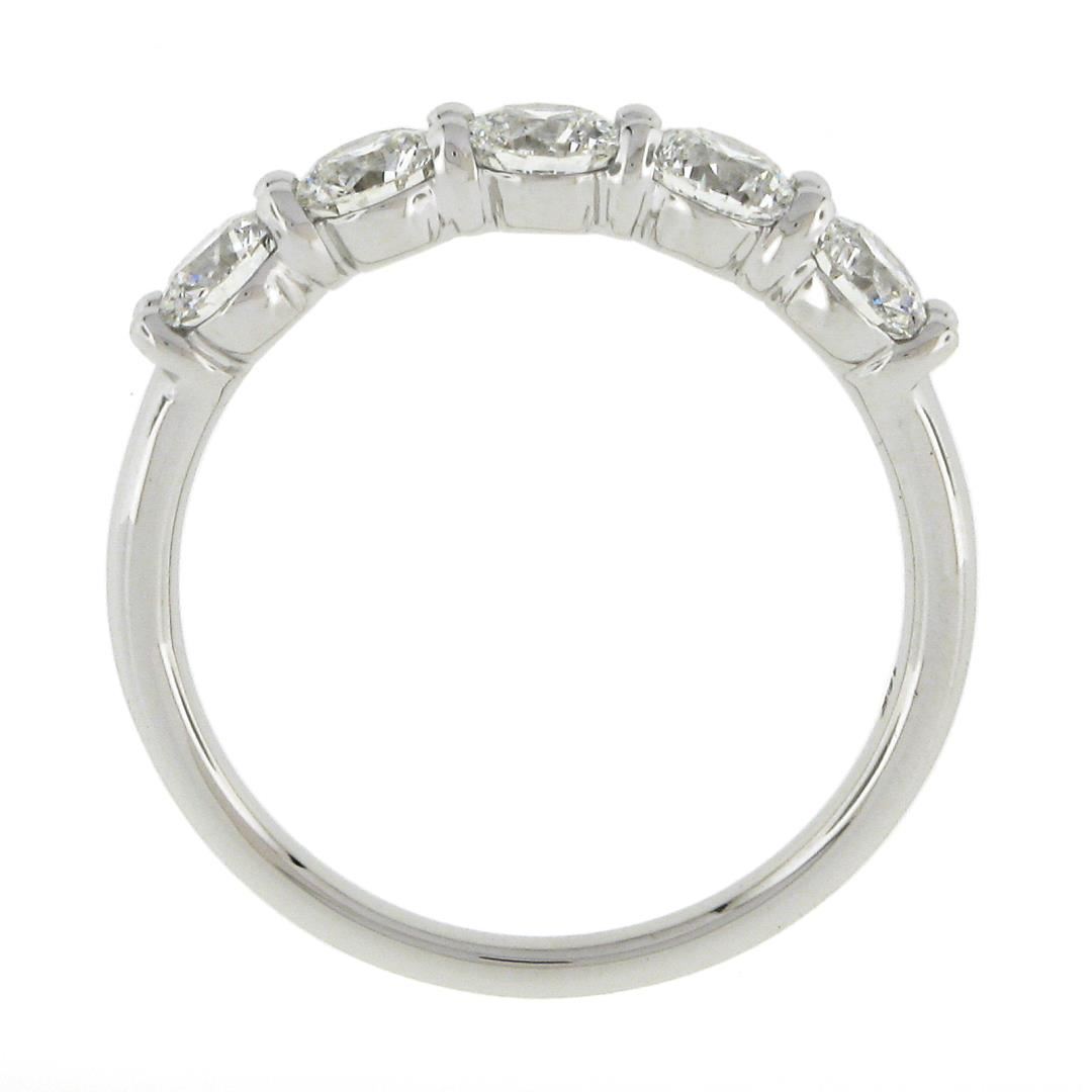 A new solid 18k white gold band ring, with 5 round idael cut natrual diamonds (F/G - VS1/VS2 ; 1.24ctw). The ring is size 6.5, weighs a total of 2.77 grams, and measures 4.1mm wide.
