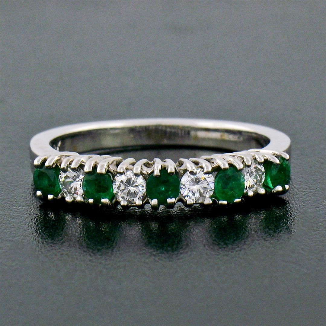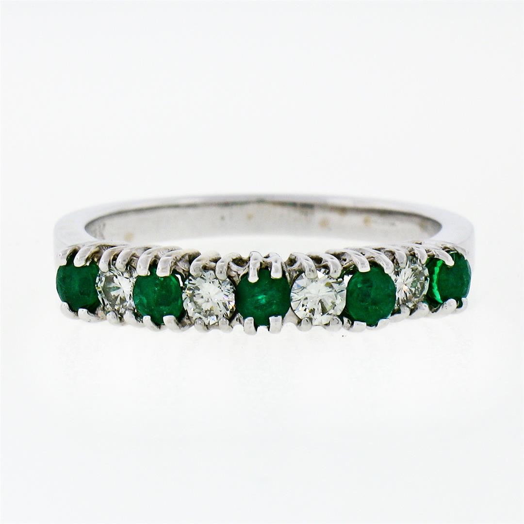 An 18k white gold band ring featuring 5 round brilliant emeralds (0.80ctw) and 4 round brilliant diamonds (F/G - VS1/VS2; 0.56ctw) set in an alternating pattern. The ring is size 6.5, weighs a total of 3.30 grams, and measures 3.75mm wide.
