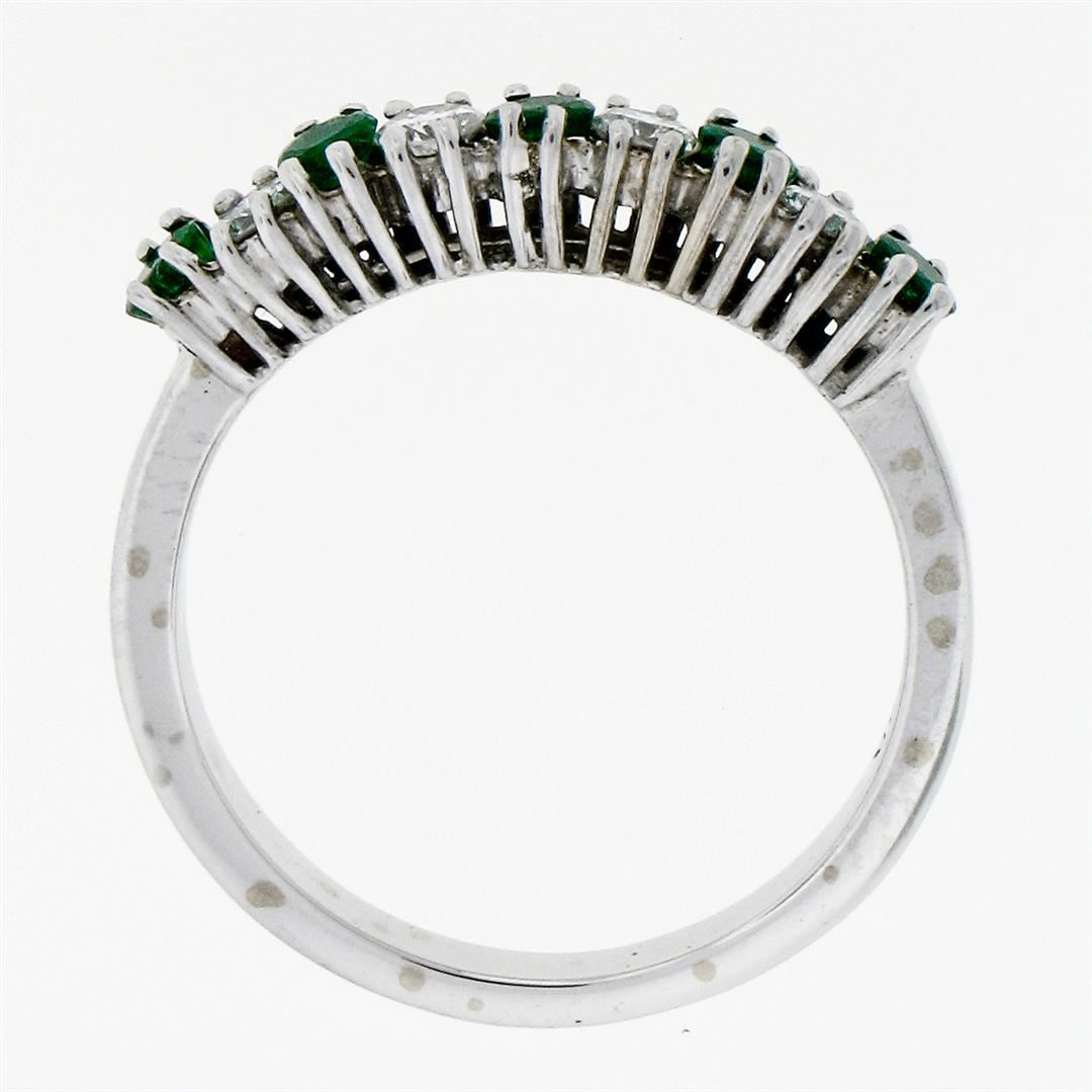 An 18k white gold band ring featuring 5 round brilliant emeralds (0.80ctw) and 4 round brilliant diamonds (F/G - VS1/VS2; 0.56ctw) set in an alternating pattern. The ring is size 6.5, weighs a total of 3.30 grams, and measures 3.75mm wide.