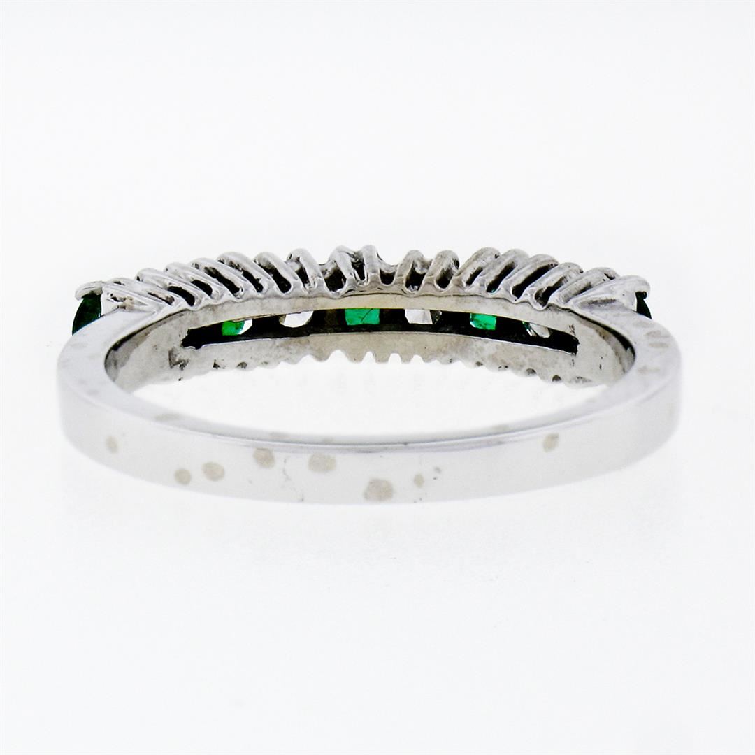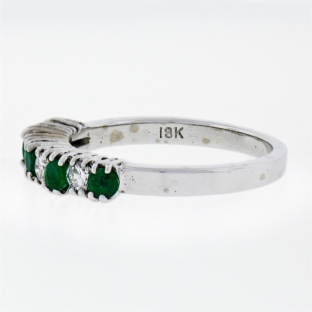An 18k white gold band ring featuring 5 round brilliant emeralds (0.80ctw) and 4 round brilliant diamonds (F/G - VS1/VS2; 0.56ctw) set in an alternating pattern. The ring is size 6.5, weighs a total of 3.30 grams, and measures 3.75mm wide.