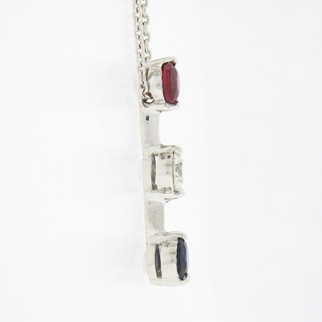 A solid 18k white gold pendant necklace, featuring 1 round cut natural ruby (0.54ct), 1 round cut natural diamond (G - VS1 ; 0.30ctw), and 1 round cut natural sapphire (0.54ct). 16 inch cable link chain, 3.45 grams total weight, pendant measures 24.9x4.85mm.