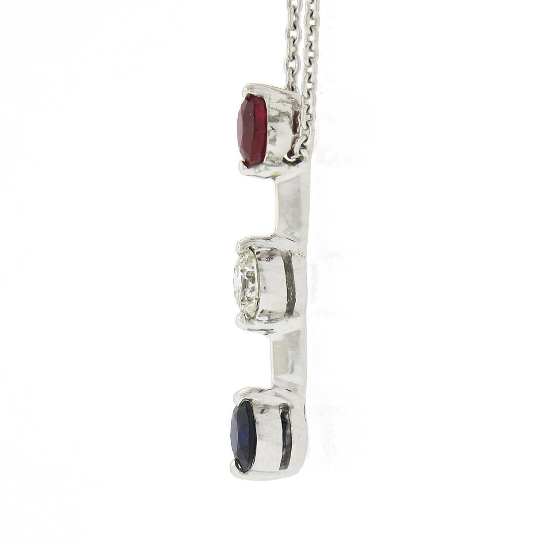 A solid 18k white gold pendant necklace, featuring 1 round cut natural ruby (0.54ct), 1 round cut natural diamond (G - VS1 ; 0.30ctw), and 1 round cut natural sapphire (0.54ct). 16 inch cable link chain, 3.45 grams total weight, pendant measures 24.9x4.85mm.