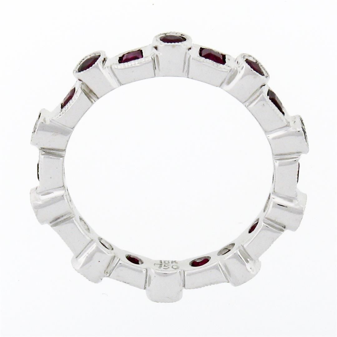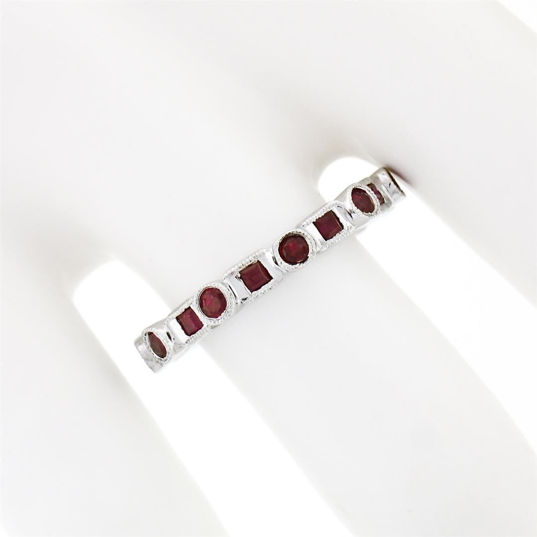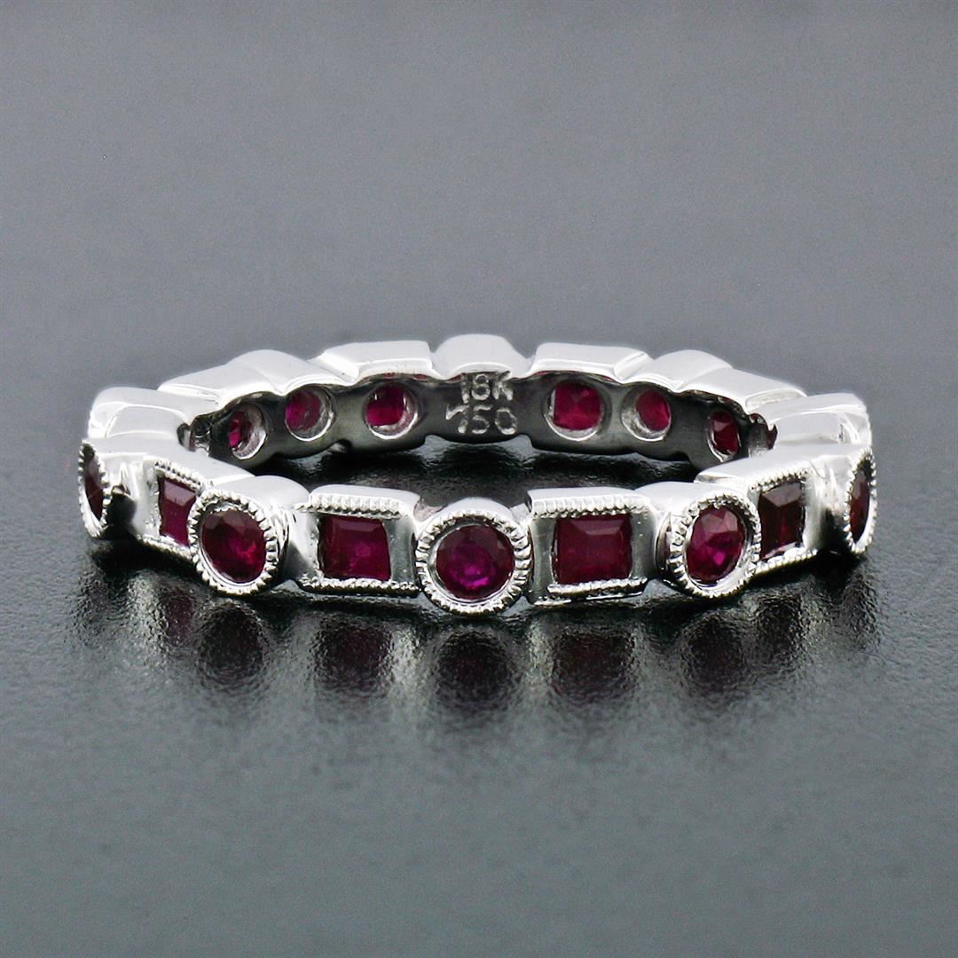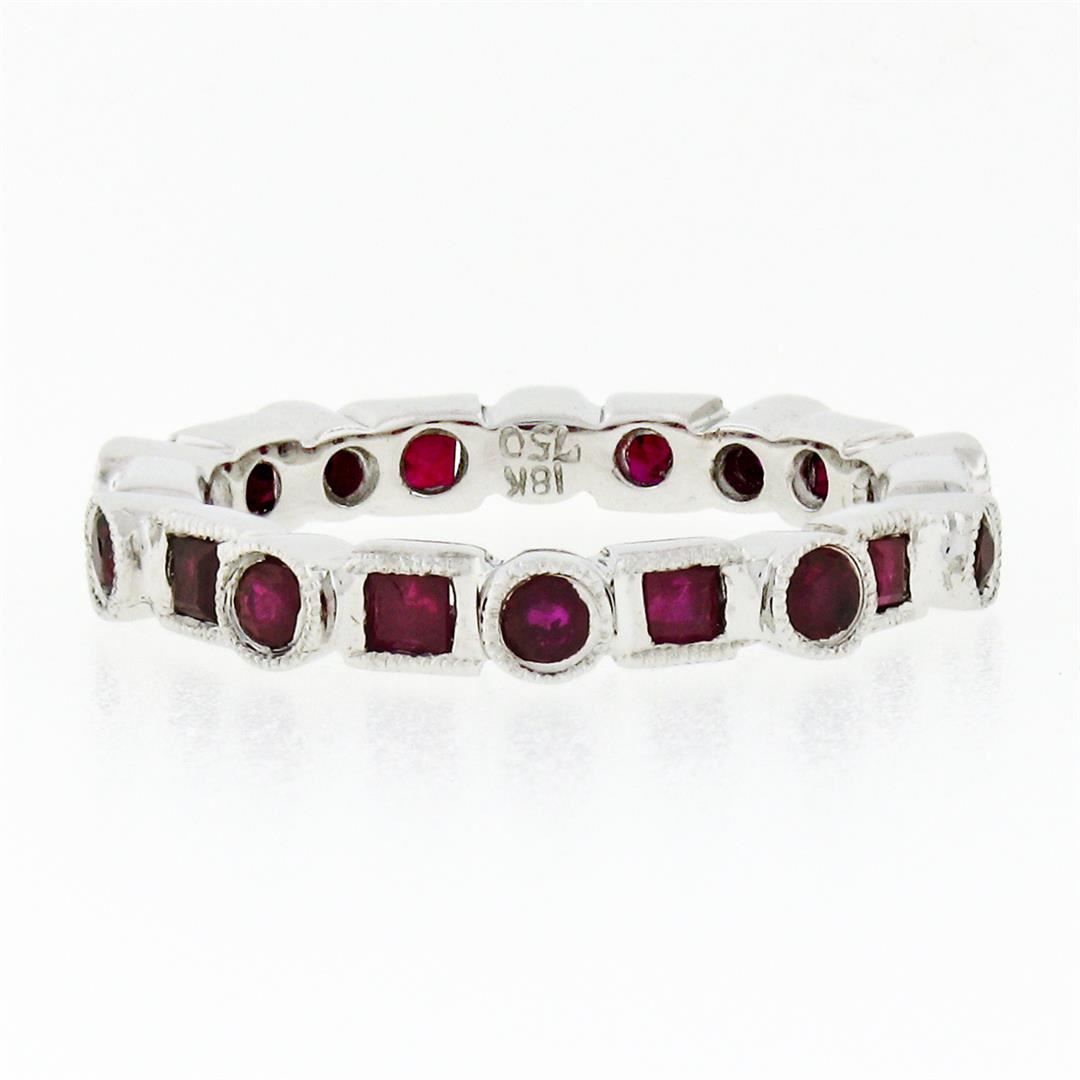 An estate solid 18k white gold eternity band ring, featuring 1.42ctw 10 round brilliant cut natural rubies, alternated with 10 square step cut natural rubies. The ring is size 6.0, weighs a total of 3.76 grams, and measures 3.05mm wide.